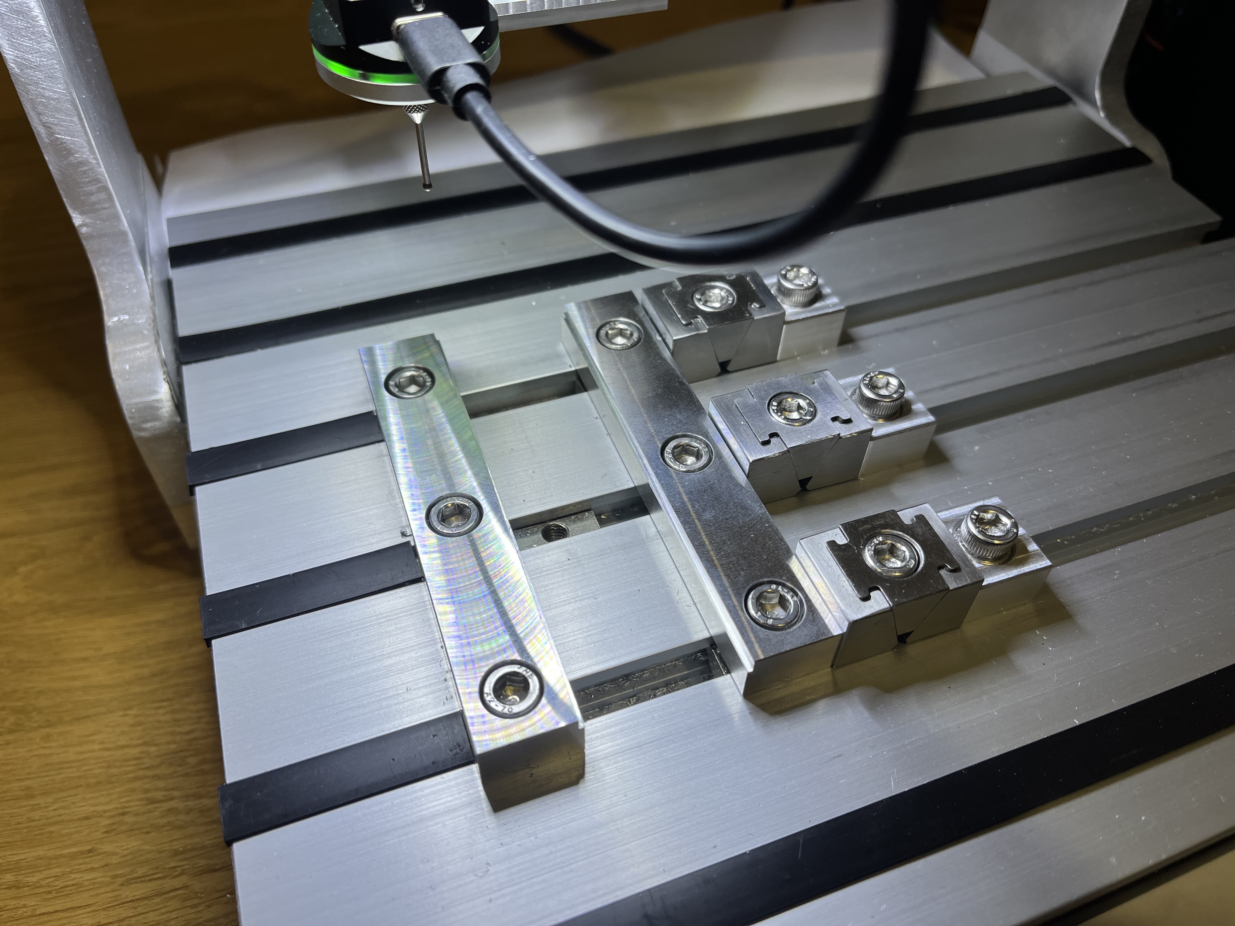 3D щуп решает проблему построения карты высот. А вот как решать проблему позиционирования каждого инструмента/фрезы по Z0?... Тиски я как раз использовал до этого. Если лист латуни 1,5 мм еще более менее. Но в целях экономии перешел на листы 1,2 и 1мм и вот их зажать в тисках нереально, их выгибает при зажатии и при работе фрезы их выгибают обратно. В тоге точность получается так себе. Ну и на финальном резе, когда контур обрезаешь - заготовка часто вылетала из тисков (т.к. сильно ослаблялась жесткость и без того хлипкого листа).