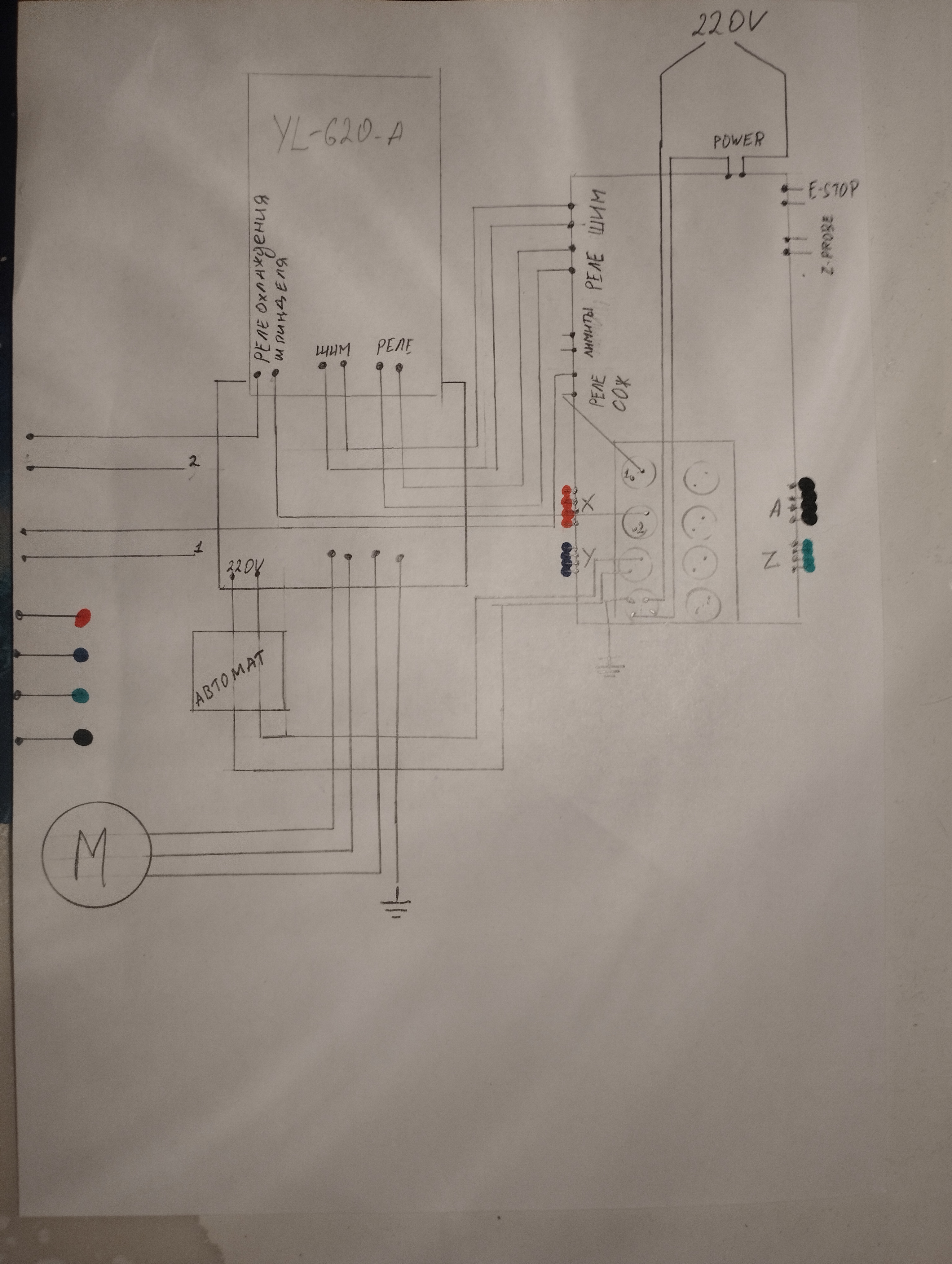 Народ, выручайте, мечтал о шпинделе 2.2 с инвертором) приобрёл наконец то, и столкнулся с такой проблемой... При включении шпинделя(задана 1 секунда задержки) за это время станок хаотично дергается движется и скачет по всем осям пока не запустишь обороты "S" после запуска оборотов помехи исчезают, но при отключении шпинделя "М5" всё повторяется, позиционирование станка сильно сбивается, мозгов не хватает от слова совсем, прилагаю фото, жду ваших решений, критики, советов, что угодно, лишь бы решить проблему ((( Станок звониться полностью(режим прозвонки мультиметра). Дополню, что заземлен экран шпинделя(только со стороны инвертора), электро-шкаф, рама станка, сам инвертор(YL620-A 2.2), блок питания драйверов тоже заземлил, в электрошкафчике не установил сетевой фильтр помех(не знаю как и куда цеплять). Провода шаговиков не экранированные(сечение провода 0.5-0.75 точно не знаю да и ранее на родном Makita 1.5Kw шпинделе всё работало исправно на такой схеме, а после инвертора начались беды)!?!!? Вообщем выручайте!!!!