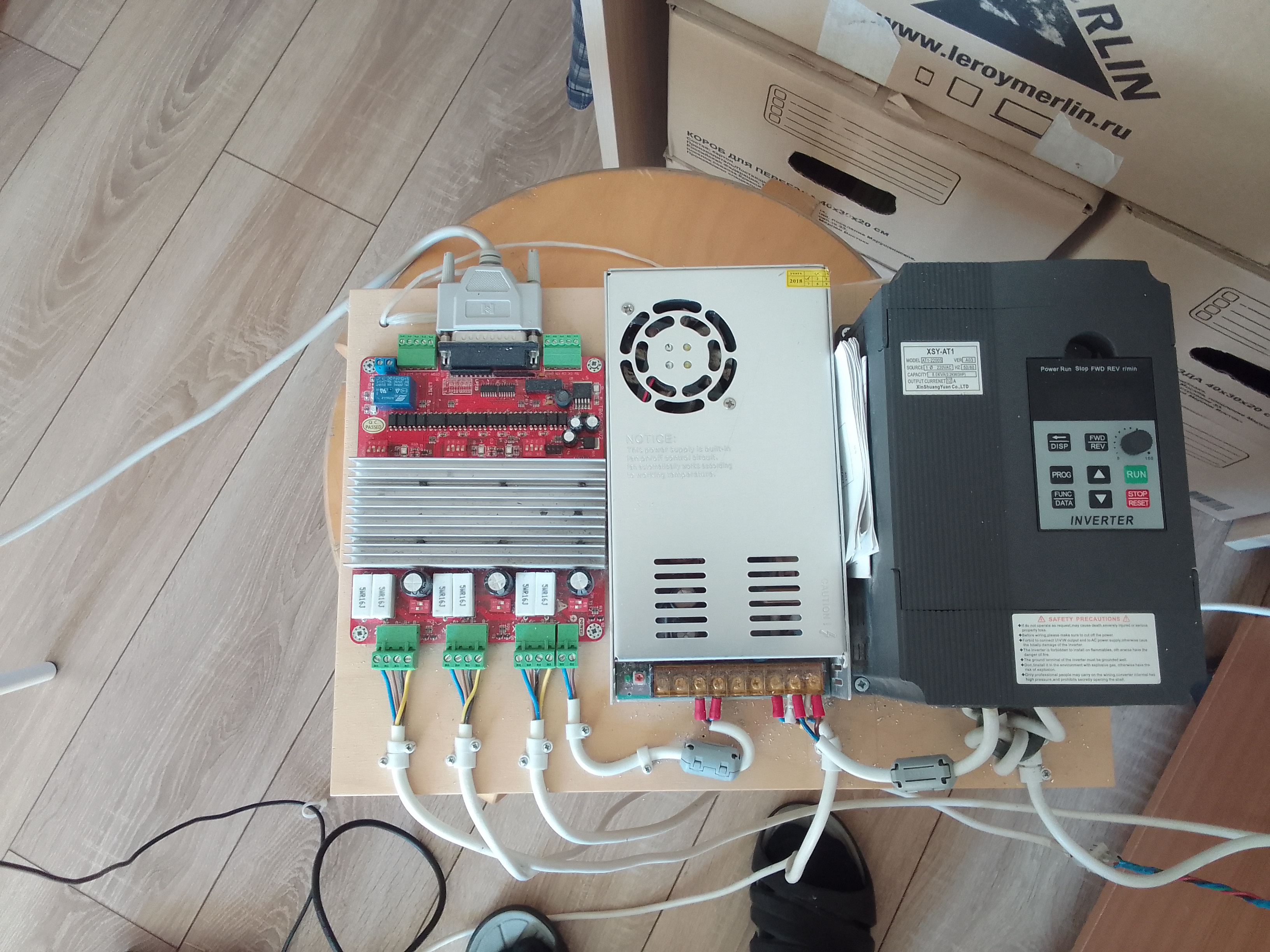 Молодец, любая проблемма решаема, если подходить к ней методически грамотно. А под занавес смотрите фото моей стойки - инвертор 2.2квт, шпиндель 1.5квт, обычные неэкранированные провода (ПВС), никаких заземлений, экранов и т.д., в общем сплошная фанера. И все работает чики-пуки...