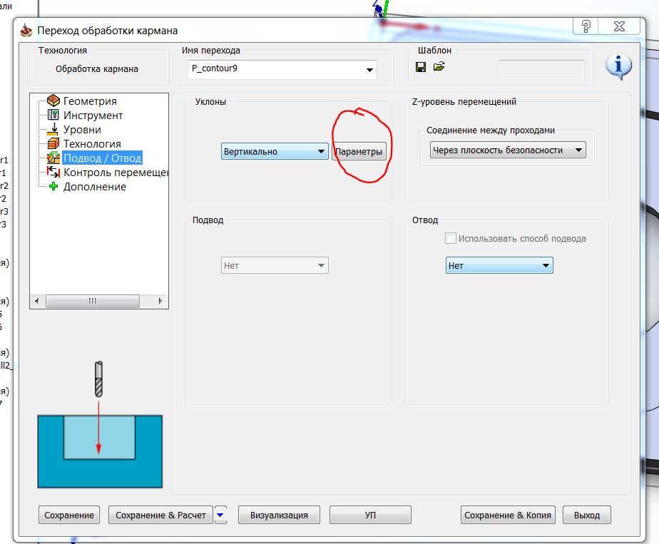 Потом задаешь обработку кармана, в технологии выбираешь контурная