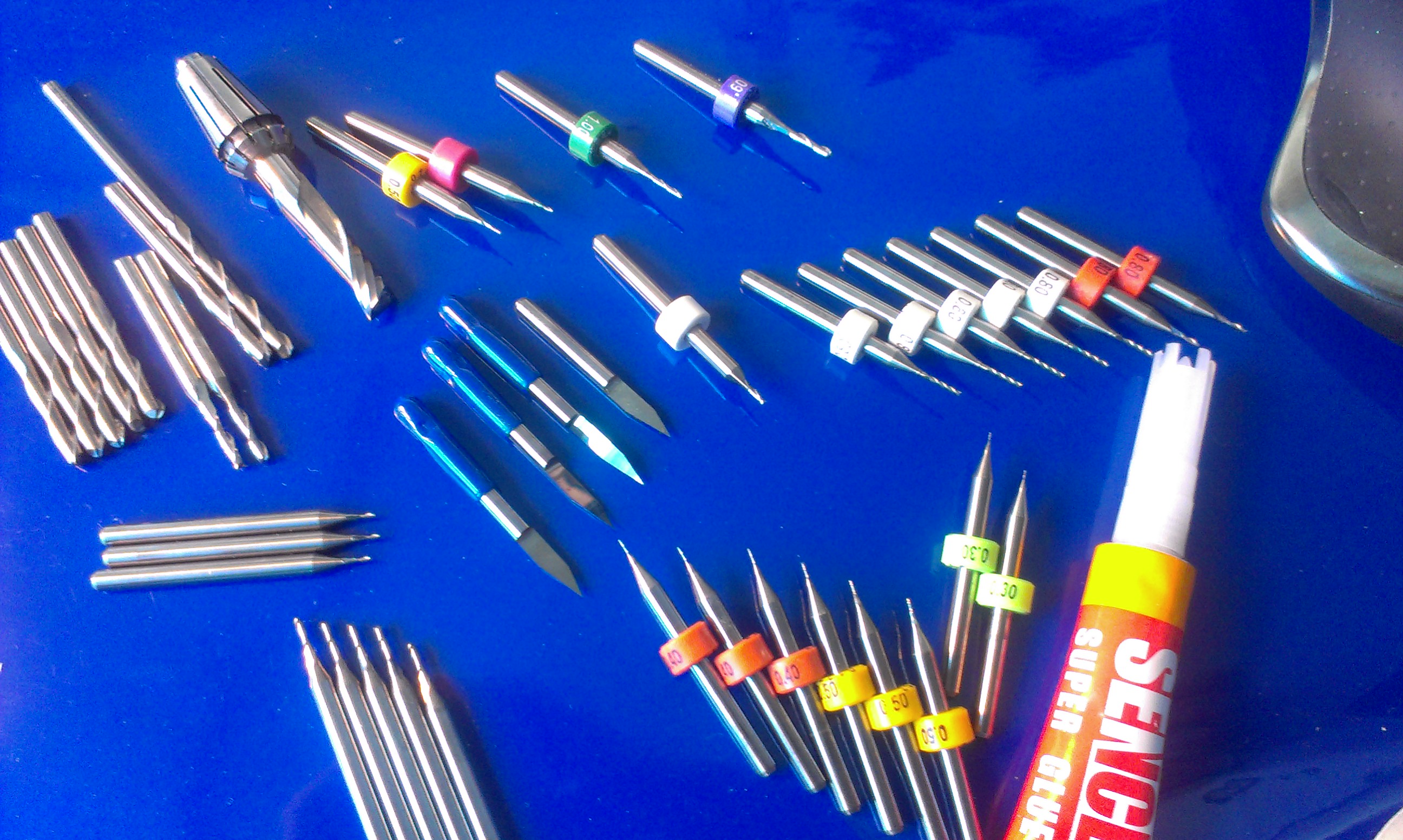 Для сравнения тюбик суперклея и обычные фрезы на 2 и 3,175 мм (слева сверху).