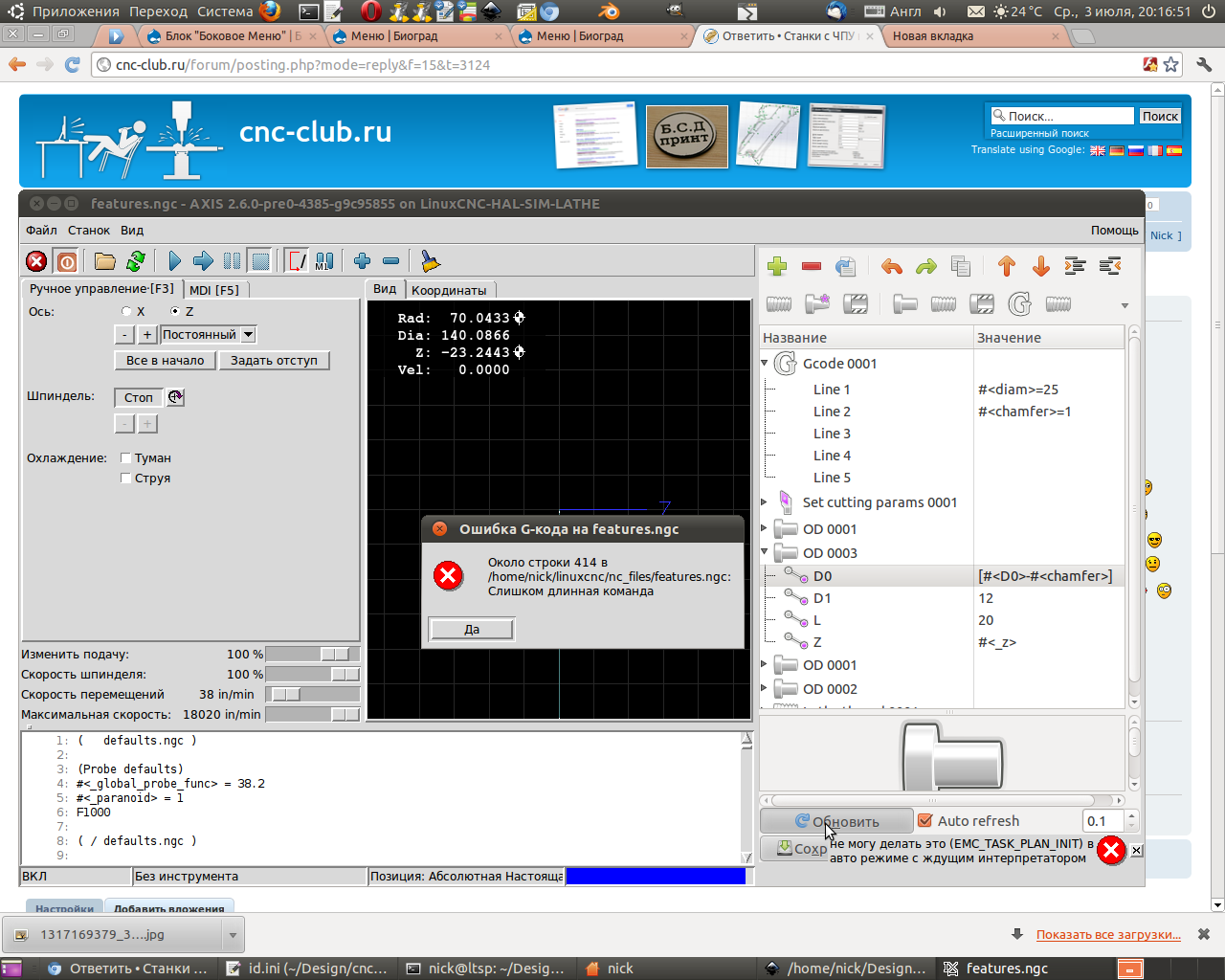 Решил еще фаски снять - получил от LinuxCNC вот такую ошибку: