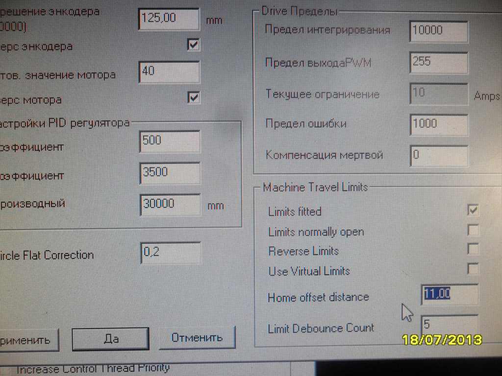 Эта проблемма легко устраняется в самой программе автоматически, нажатием одной кнопки. А тут ситуация другая Всё дело в подаче напряжения 24в на контроллер, его то и подаёт кнопка на передней панели. Пока нет напряжения программа будет давать position error. красный цвет проводов в конектах.Nick писал(а):Если у тебя стоят серво двигатели, то это может означать, что обратная связь от двигателя не соответствует заданию, т.е. контроллер видит, что станок ушел от заданной траектории = ошибка.