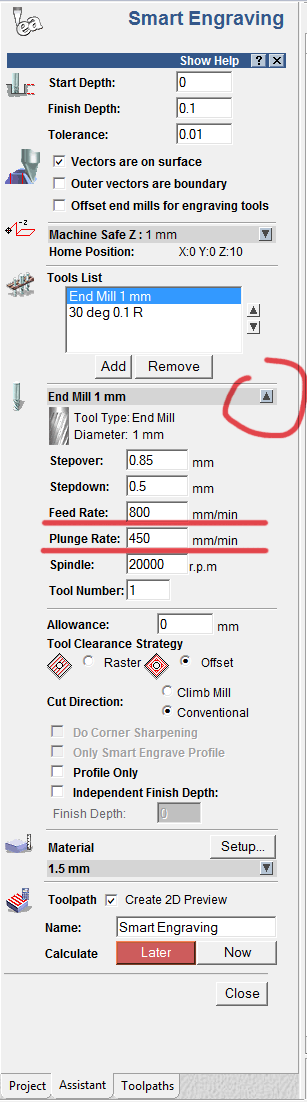 Только нужно быть внимательным и посмотреть, в каких единицах задается скорость. Обычно скорость задают в миллиметрах в минуту. Так же после того, как инструмент выбран для расчета траектории - можно нажать на треугольничек справа и развернуть параметры инструмента,