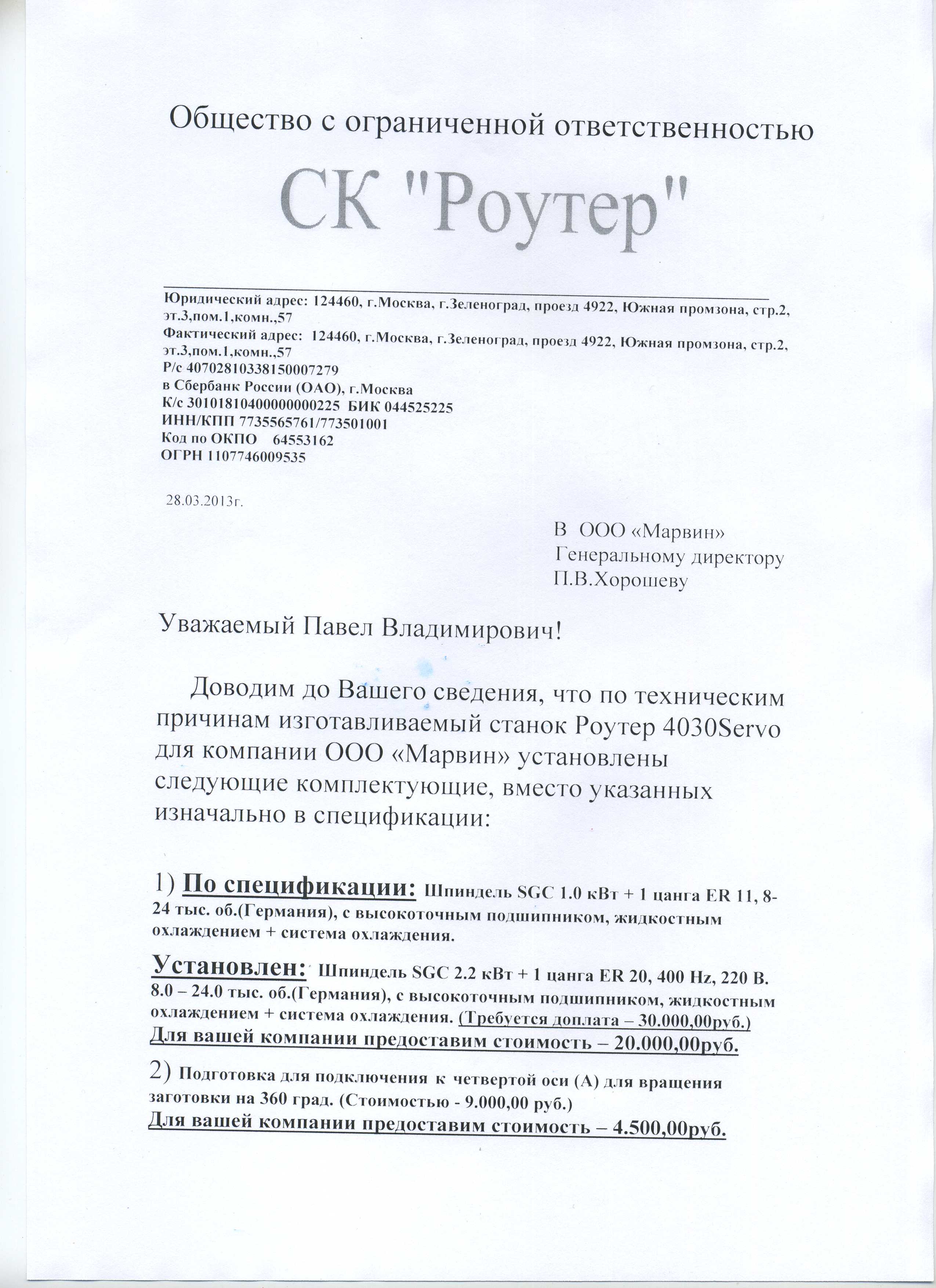12 февраля 2013 года моя компания (ООО «Марвин») оплатила ООО «СК Роутер» 30% предоплаты за станок 4030servo с 1 кВт шпинделем. Станок должен был быть изготовлен в течение 30 рабочих дней. 14 февраля они начали работы. 28 марта (т. е. по истечении срока) они сообщили мне, что установили на мой станок шпиндель мощностью 2.2 кВт вместо заказанного 1 кВт шпинделя, и что я должен доплатить за него 30 000 рублей, но они мне сделают скидку величиной 10 000 рублей; а также поставили (я этого не заказывал) предподготовку для установки 4-й оси, стоимостью 9 000 рублей, но они мне сделают скидку в 4 500 рублей; а также потребовали, чтобы я второй раз (прилагаю сканы документов, которые они выставили мне для «дополнительной оплаты» сначала и потом — после моего возмущения необходимостью дважды оплачивать одну и ту же опцию) оплатил (15 000 руб.) им опцию («Датчики нулевой оси X, Y, Z для определения и коррекции координат при смене инструмента» - т. н. автокоррекция инструмента), которую я уже оплачивал ранее при заказе станка. Я сказал, что мне не нужен шпиндель мощностью 2.2 кВт. И СК Роутер понадобилось ещё 30 рабочих дней, чтобы заменить шпиндель на 1 киловаттный. За это время, из-за задержки с поставкой, от станка отказался его конечный заказчик и станок пришлось выкупать (т. е. выплачивать остальные 70%) нашей компании.
