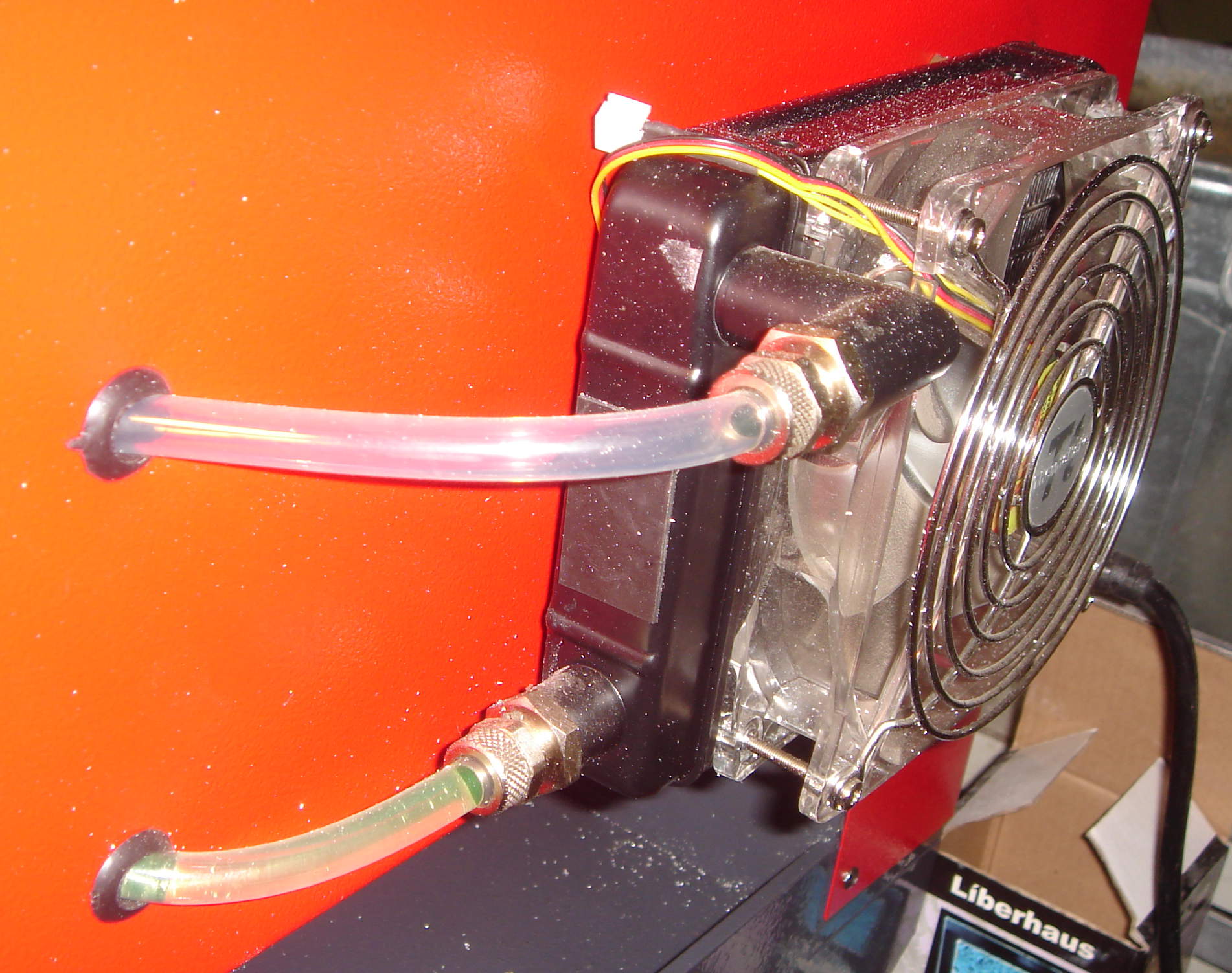 4. система охлаждения шпинделя не работает: в жидкости крупные пузыри, которые загоняются в шпиндель и оттуда уже не выходят, а ток жидкости блокируется. Только лишь после выключения станка из шпинделя поднимаются загнанные туда пузыри, образующие внутри воздушный замок. На задней стенке, на которой установлен радиатор охлаждения шпинделя, видно (фото приложены), что трубка на всём протяжении от выхода из станка и до входа в радиатор — заполнена воздухом. Т.е. воздушный замок — не только на входе в шпиндель, но и на входе в радиатор. Без охлаждения шпиндель быстро сгорит. Кроме того, ясно, что где-то внутри станка происходит утечка тосола и он капает на какие-то части станка. Вот ссылка на видео, показывающее — как образуется воздушный замок в шпинделе: https://www.youtube.com/watch?v=GIWBoZP-lPo