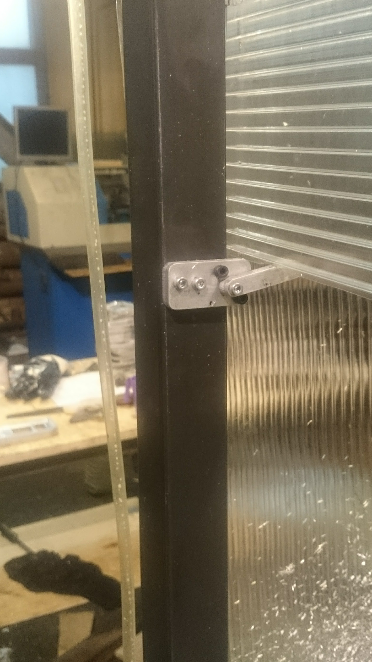 Дверь открывается наверх. Есть минус - когда на нее налипает стружка можно получить себе за шиворот охапку, если случайно задеть дверь головой.