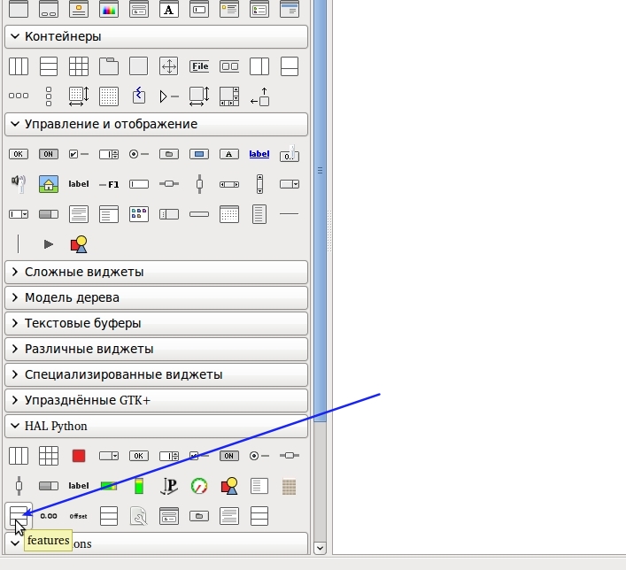 сейчас при попытке вставки виджета features в Glade "обычным" способом программа вылетает...