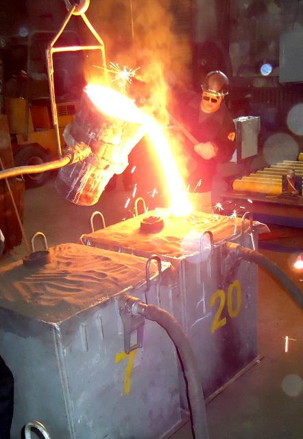 Технология такая: из пенопласта плотного вырезан меч, обмазан вододисперсионной краской (пару слоев), помещен в стальную трубу, обсыпан с утрамбовкой старой шпатлевкой "Старатели". Все, форма готова. В нее льем расплав. Модель выгорает, замещается расплавом. Обязательно сверху надо делать прибыль, чтобы за один раз хватало на всю деталь, т.к. аллюмний не сразу замещает модель.