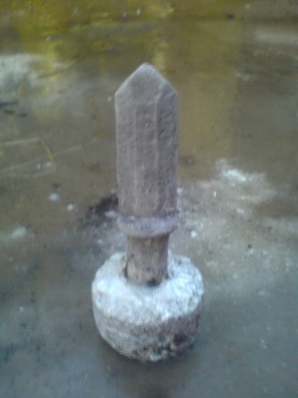 Технология такая: из пенопласта плотного вырезан меч, обмазан вододисперсионной краской (пару слоев), помещен в стальную трубу, обсыпан с утрамбовкой старой шпатлевкой "Старатели". Все, форма готова. В нее льем расплав. Модель выгорает, замещается расплавом. Обязательно сверху надо делать прибыль, чтобы за один раз хватало на всю деталь, т.к. аллюмний не сразу замещает модель.