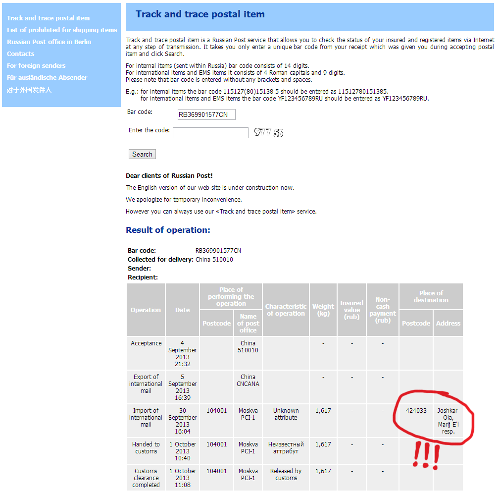 по трек номеру неверный индекс, и, боюсь, шпиндель может уехать в Йошкар-Олу.