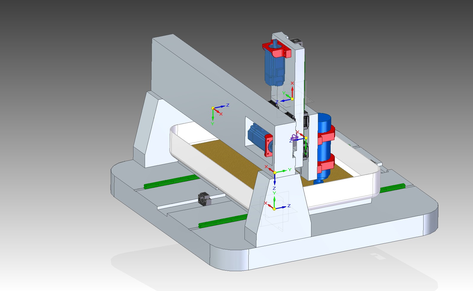начал проэктировать свой первый самодельный станок. рабочее поле 600х400х150мм. задачи обрабатывать дюраль латунь немного нержавеечки потихоньку ну и дерево пластик на больших скоростях. выбрал схему с подвижным столом.