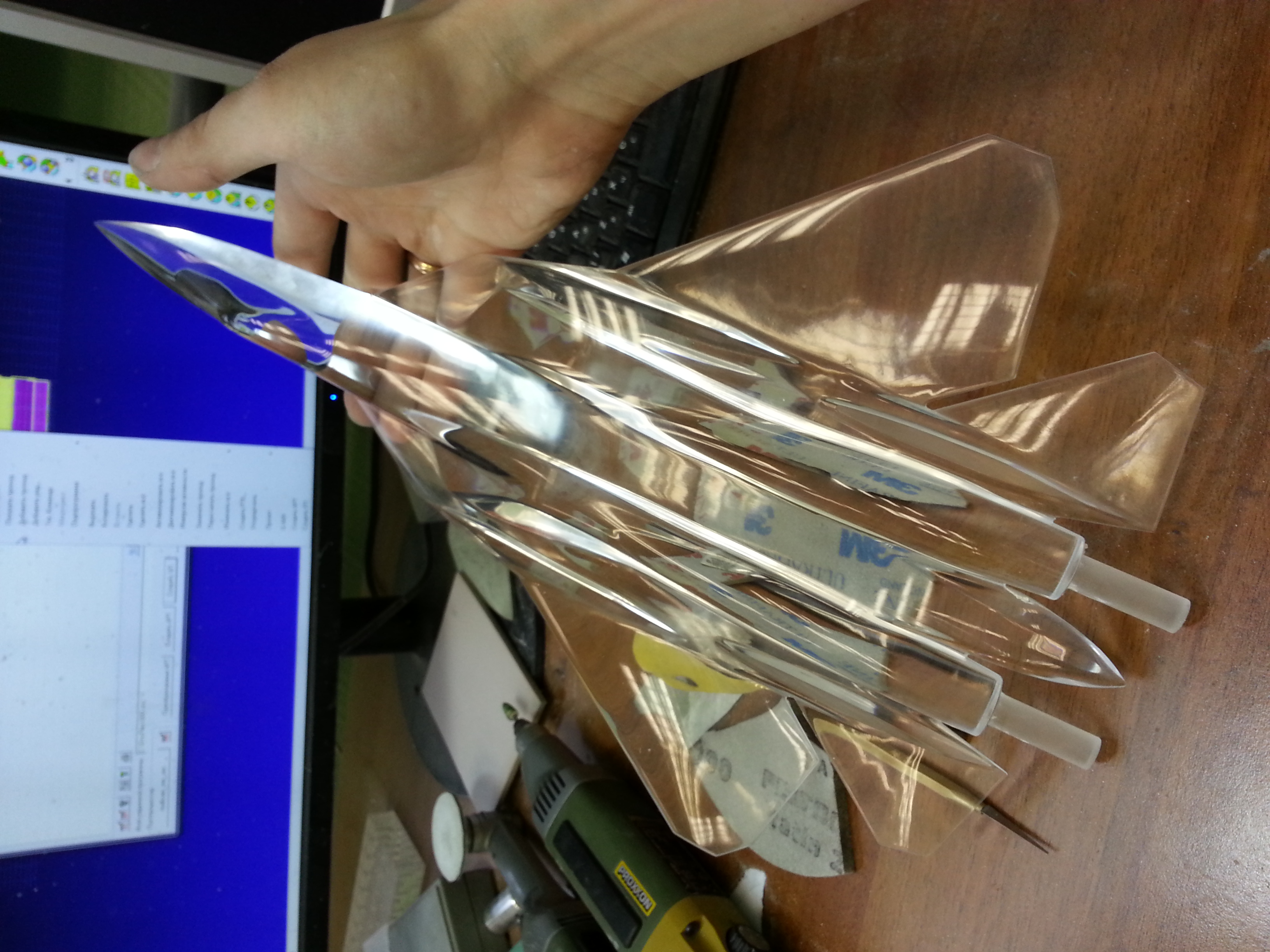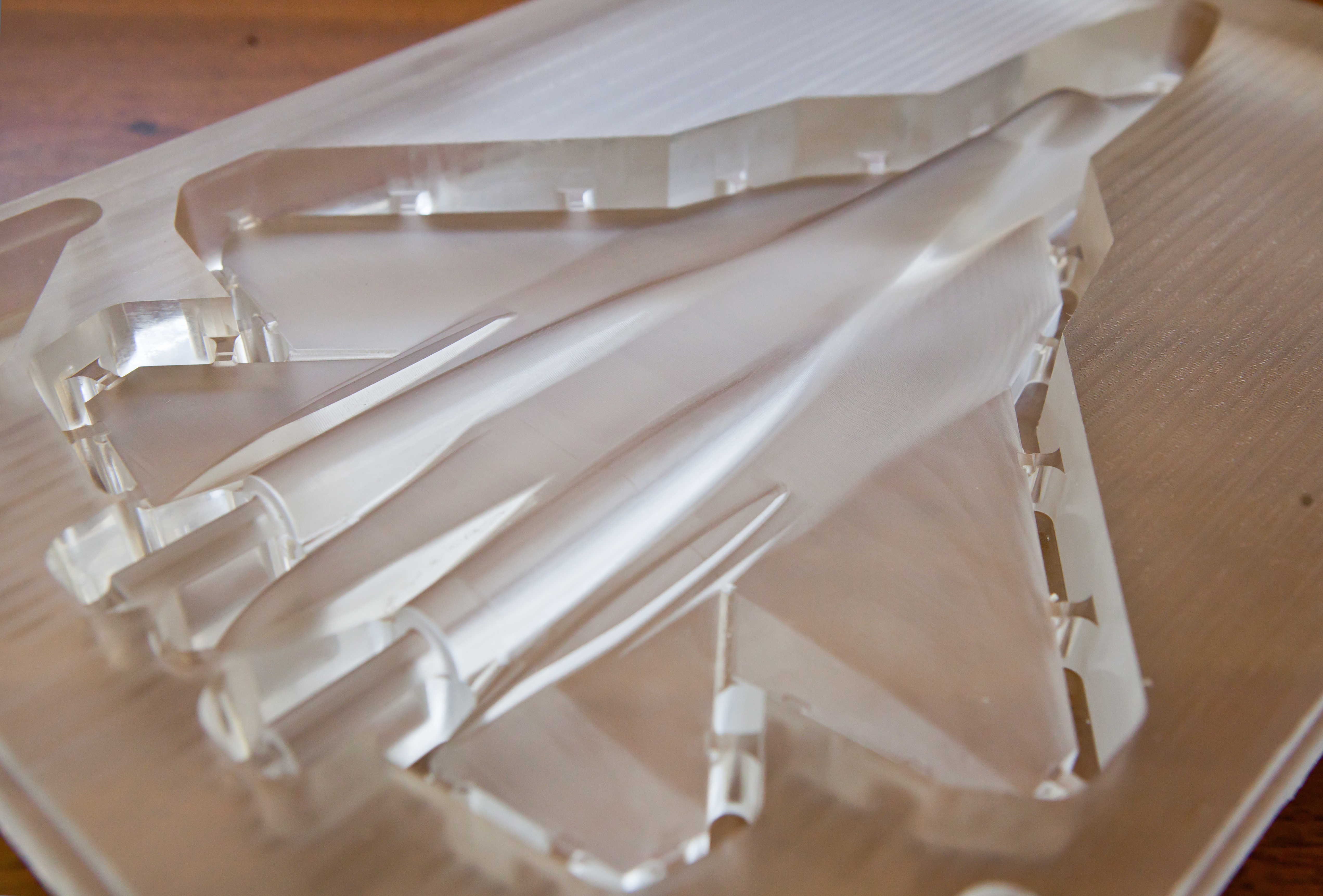 зделан из куска оргстекла толщиной 38мм. кили зделаны отдельно и приклеены. фрезеровать недолго 2 дня всего а вот на полировку ушло много времени.