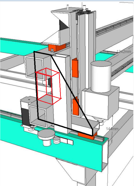 Плохая идея с укосами из труб. Трубу(стойку) между балками портала оставь, укороти трубы до стойки, вроде у тебя там на эскизе габарит оси Z не выступает за стойки. Прикрепи пластину сбоку к трубам портала, опоре и стойке, хоть болтами хоть сваркой, вроде говорил что сварки не боишься.Kulibin74 писал(а):Если сделать так?