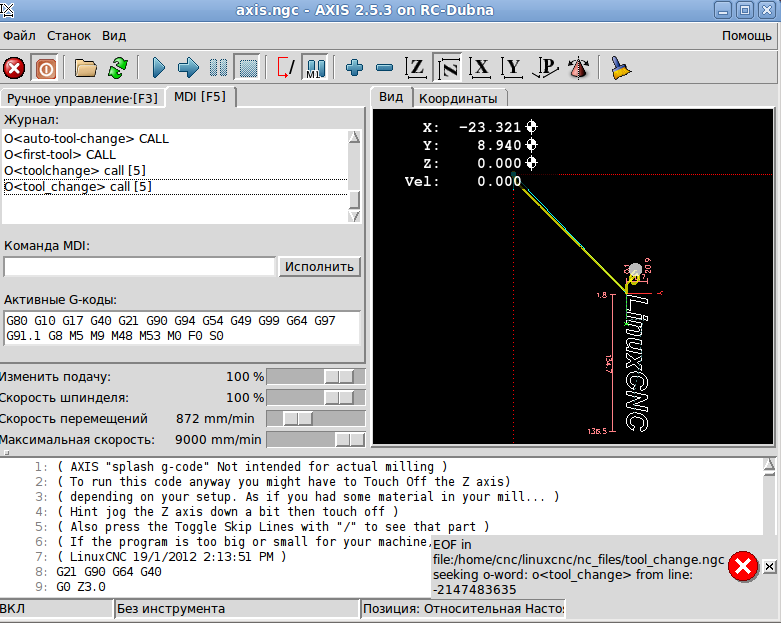 Что делаю дальше... Обнуляю станок по концевикам, переезжаю в некоторую другую позицию, делаю отступ, пытаюсь выполнить O-Code и получаю следующую ошибку. Что я делаю не так????