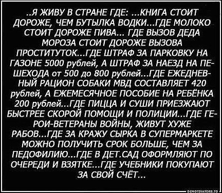 На почте вырубился свет в том месте где лежат все отправления, и некоторым отказывали выдавать посылки. Народ начал вонять, орать на тетку которая выдает, мол делайте свою работу, мол вы плохая почта и т.д. Я вот иногда поражаюсь, ну вот если не нравится Вам почта России нахрена вы ей пользуетесь? Если вы придете в ресторан, и там не вкусно приготовят еду, вы будете туда постоянно ходить и каждый раз кричать ах вы плохой ресторан так невкусно готовите? Или купите в магазине пиво, а оно окажется мочой, в следующий раз вы его же будете покупать (и в селедующий...)?