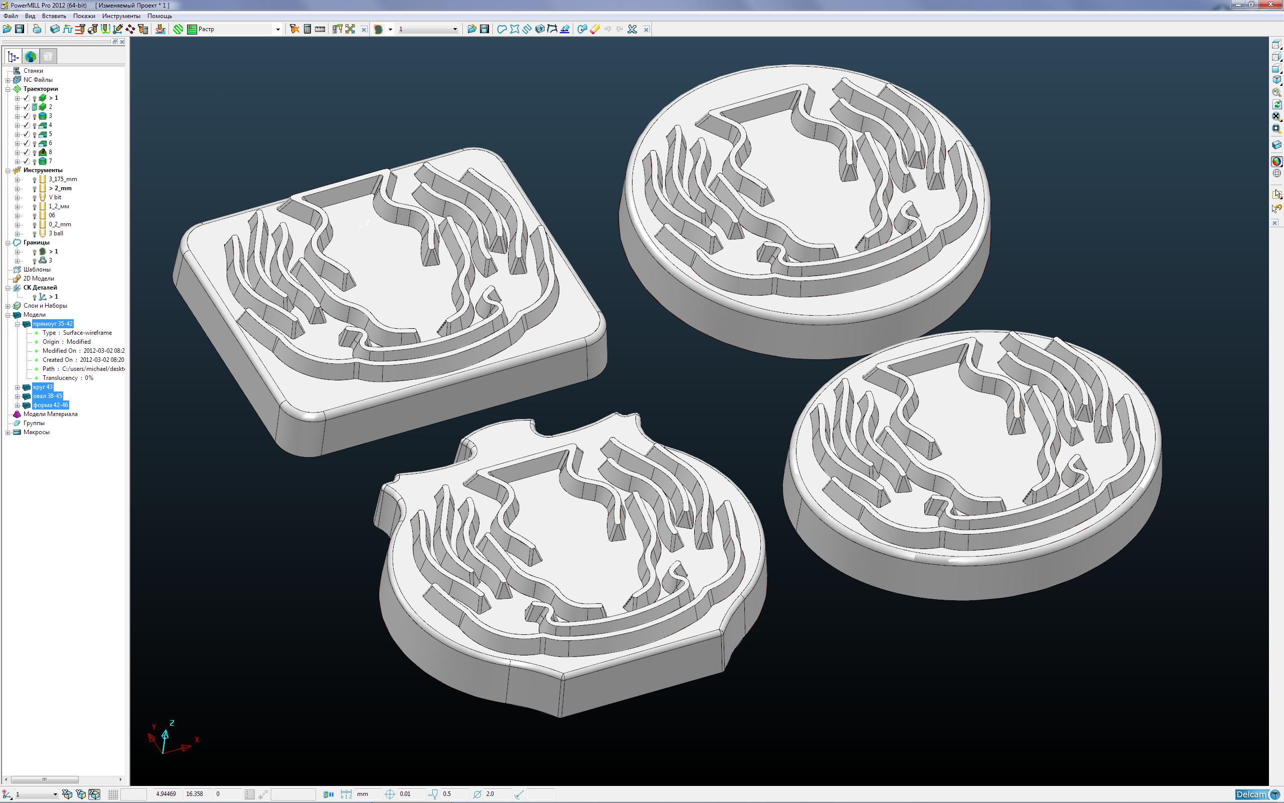 Я открыл и разместил рядом 4 модели. У моделей можно выбирать отдельные элементы, если потребуется обработать какие-то участки. 2. Создал автоматически заготовку (обычный параллелепипед). 3. Создал систему координат, указав на нужный мне угол заготовки. Активировал эту систему координат, и пришлось заново создать заготовку уже в новой системе координат. 4. Выборка "большой" цилиндрической фрезой (предварительно была создана граница вокруг деталей с учетом диаметра фрезы и припуска). 5. Доработка более тонкой фрезой (1,2 мм). 6. Обработка боковых граней гравером с чуть более острым углом конуса чем требуется, поэтому - обработка в несколько проходов. 7. Обработка плоскостей (при черновой обработке я оставил небольшой припуск). 8. Доработка более тонкой фрезой узких участков. 9. Обработка скругления и боковых стенок фрезой со сферическим концом. 10. Обрезка по контуру (в т.ч. нижней части, где сферическая фреза не достала). Картинки форум уменьшает. Вероятно, придется открывать оригиналы файлов для просмотра.