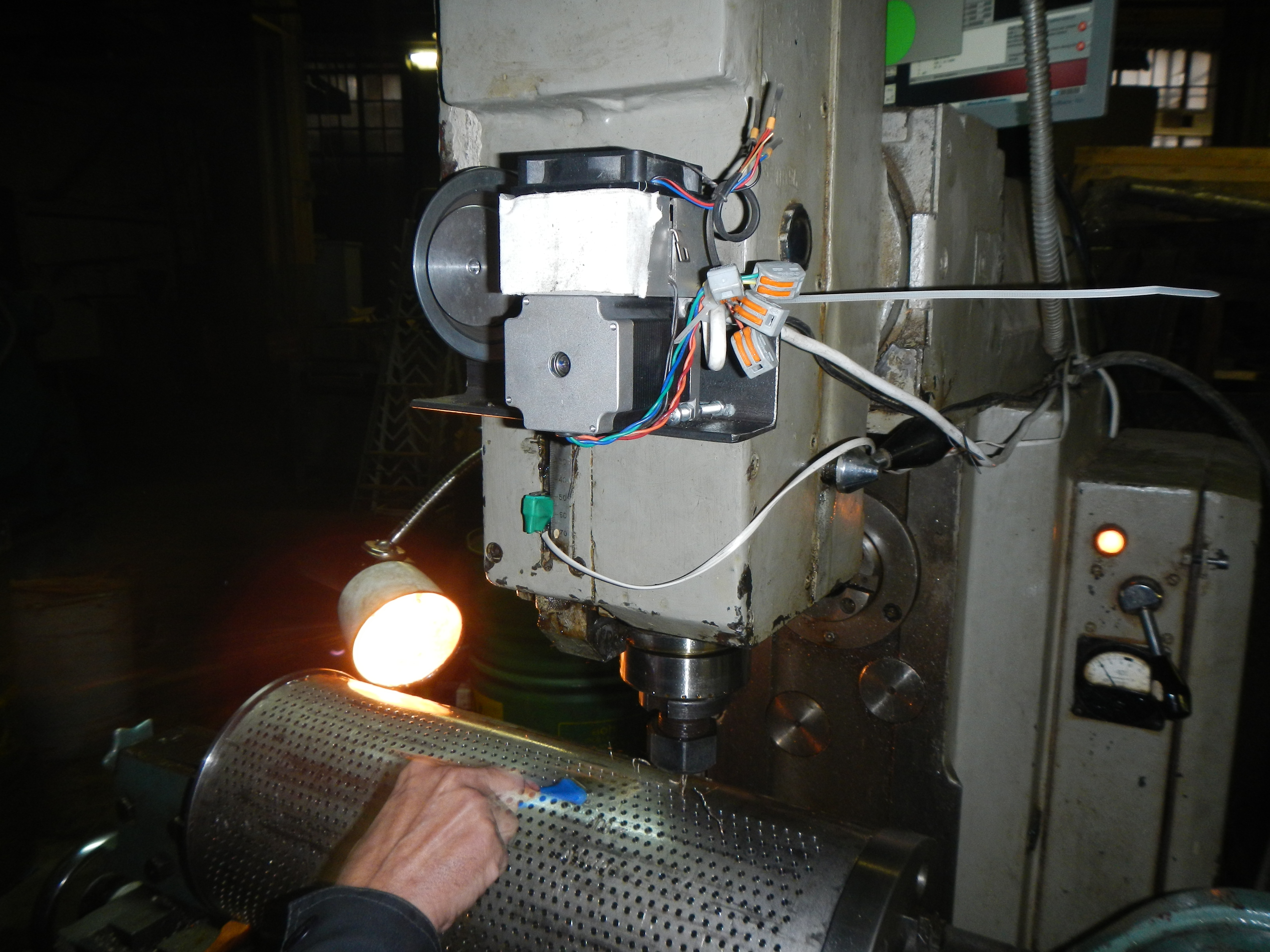 В общем пришел заказ сделать 100500 отверстий в трубе. Вручную фрезеровщик делает около 150 отверстий в день (это если хороший день). Попробовали делать подачу не пинолью станка, а столом на автоподаче, получилось на 30 отверстий больше. Но через день автоподача вылетела :). Да и кощунство это стол гонять ради 4 мм сверла.