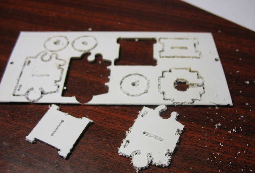 Играюсь в пазлы )) Материал немного не нравится стружка прилепает к краю приходится ножиком очищать. Это прототип , есть небольшая кривость из за плохого крепления заготовки, но пока идет изучение прототипа )))))