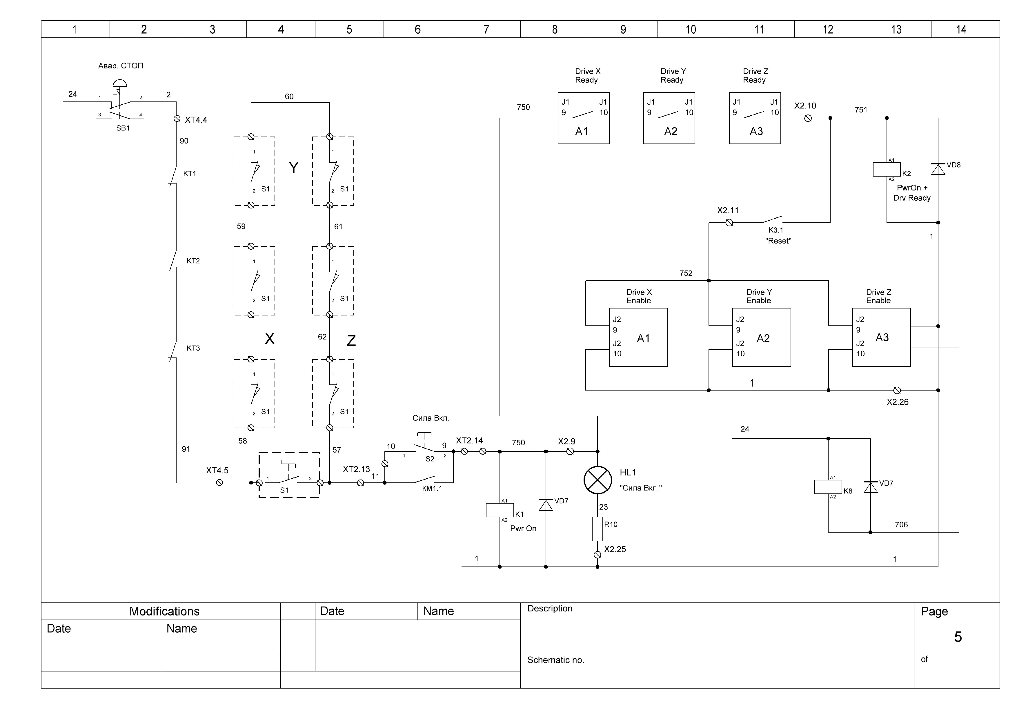 Еще маленько влезу в разговор. Схема питания и аварийная должна быть привязана к типу приводов (ошибки в проектировании бывают даже на профстанках-весной у друга на 14метровом станке консоль почти 2 тонны весом вышла проветрится не помогли не упоры не два контура безопасности не три концевика, хорошо что станок стоял вплотную к углу выпирающему из стены консоль в него уперлась и повисла на двух линейных подшипниках, еле обратно запихали). Если аварийная ситуация однозначно на все приводы сигнал стоп, наср...ть на заготовку (наверно только электрикой этого не добиться?) Сначала безопасность людей/потом безопасность оборудования/ и только потом сохранность инструмента и заготовки. Конечно бывают случаи когда заготовка супердорогая дороже станков, но это другая история.