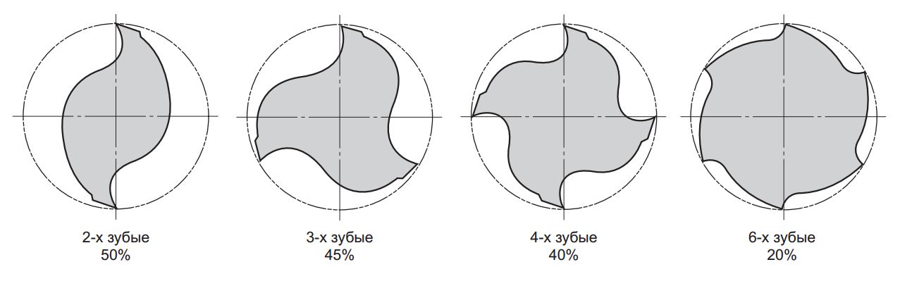 Думаю ни для кого не секрет (и дальше по тексту думаю ко мне ни раз придет кэп, а многим знатокам можно даже не читать буквы, а просто посмотреть фотки), что чем больше фреза имеет зубьев, тем меньше площадь стружечных канавок, а следовательно объем материала снимаемого фрезой за один рез меньше. А поскольку алюминий значительно расширяется при срезании применяются фрезы с меньшим количеством перьев, а для сталей и более твердых материалов, которые имеют более высокие температуры плавления применяются фрезы с большим количеством перьев: во-первых это снижает вибрацию, повышая стабилизацию и прочность фрезы, а во-вторых производительнее снимать несколько мелких стружек за один оборот фрезы пусть и меньшего объема. Отличная картинка есть в каталоге фрез митсубиши: