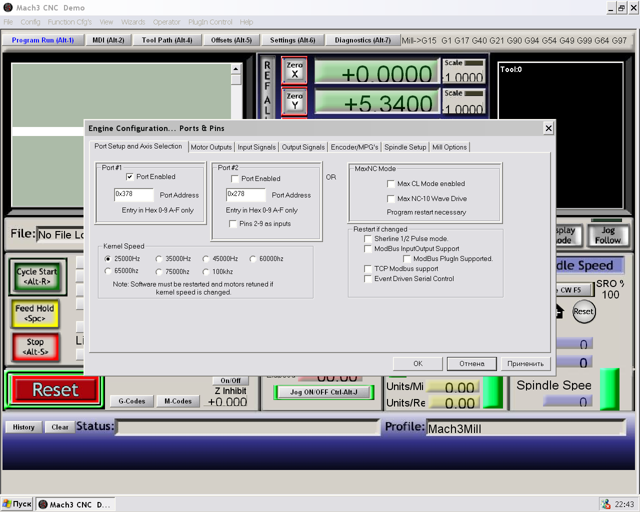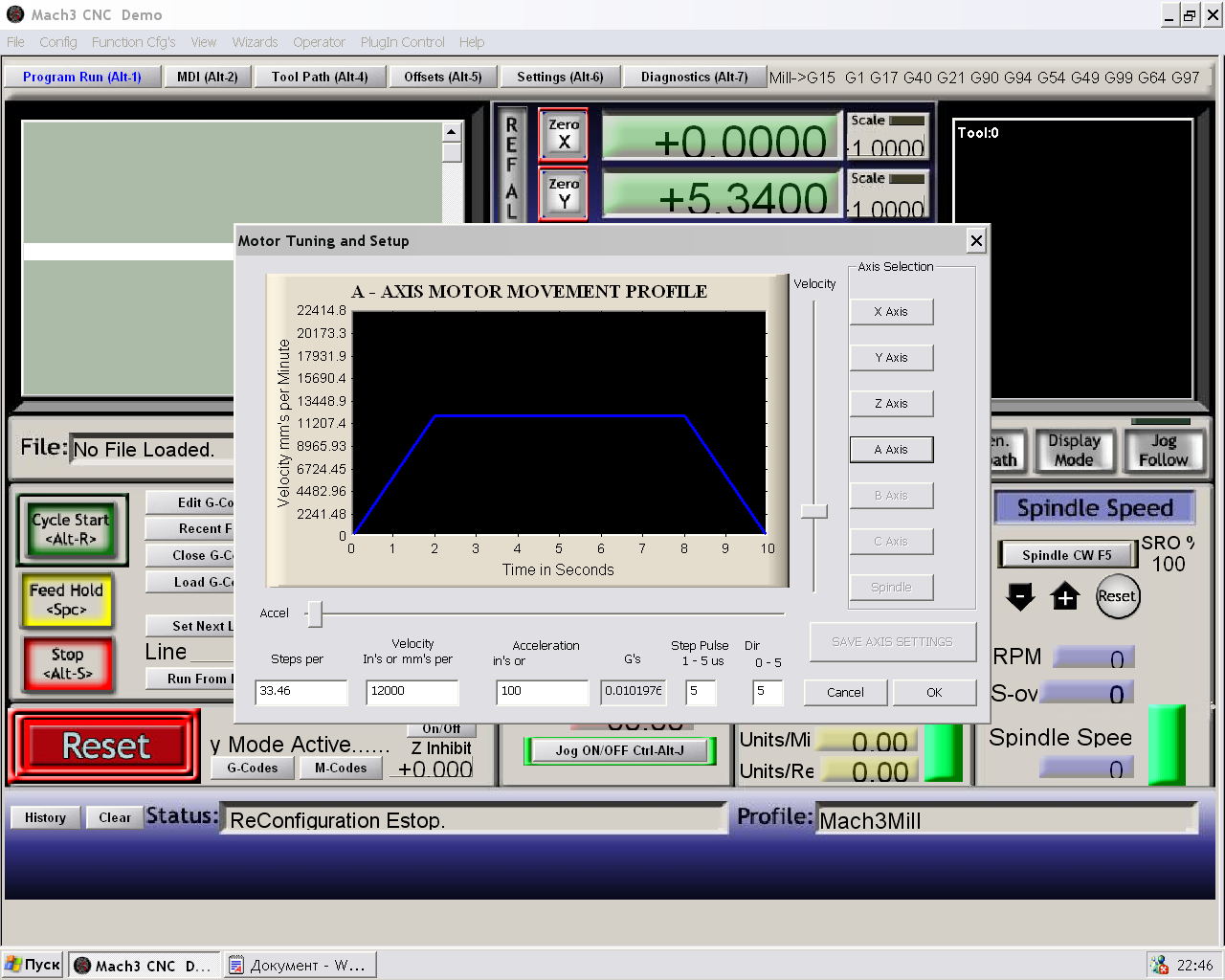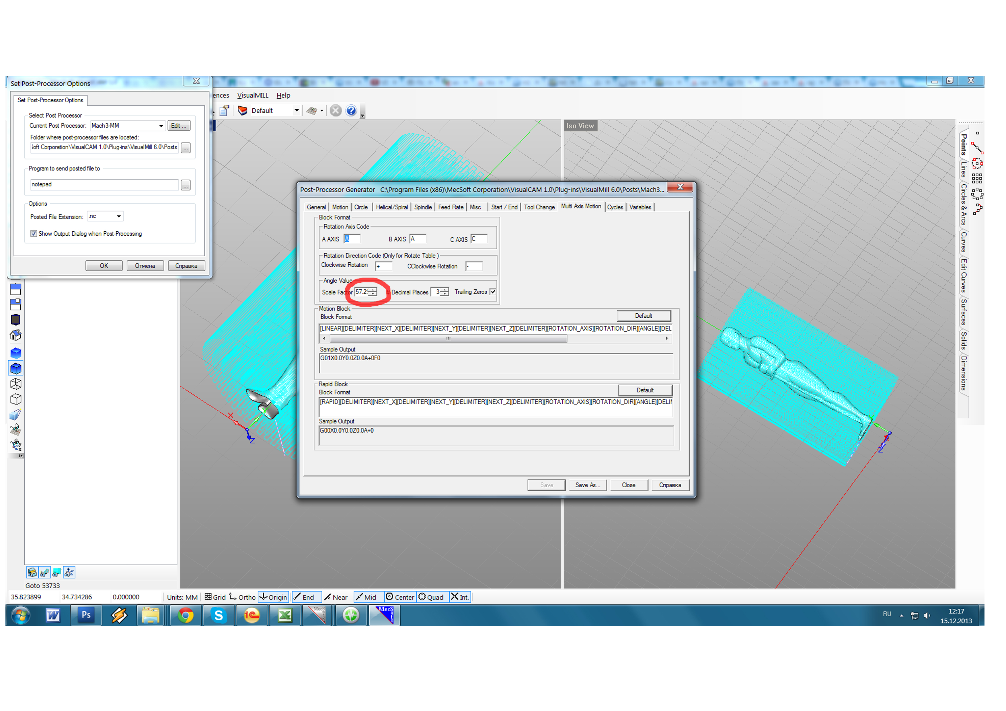 Есть проблема с поворотной осью. Оговорюсь, ось А раньше не использовал, пытаюсь настроить впервые. Обкатывал работу оси при выключенном шпинделе и без фрезы и как выяснилось не зря - эта методика помогла понять некоторые особенности. При выполнении УП MACH по коду УП должен проворачивать на несколько градусов заготовку, отрабатывать осью Y и снова сдвигать и так все 360 градусов. А происходит следующее: поворот с 0-ля до к примеру 1-го градуса происходит через проворачивание оси А на 359 вокруг оси. Другими словами, каждый сдвиг (поворот по оси А) происходит не по кратчайшему расстоянию, а через проворот оси А в противоположном от кратчайшего направлении. Прочел много форумов, где хоть как-то поднималась эта проблема, но ничего не нашел, либо тема на форуме переходила в обсуждение другой проблемы http://mir-cnc.ru/index.php?/topic/3551 ... B2-mach-3/ , либо решением являлось изменение всех отрицательных значений параметра при оси А на положительные. Я поменял часть значений моего G-кода прямо в MAch(там есть возможность редактирования G-кода прямо в окне программы) и как не странно станок отрабатывал поворот как нужно, шел в соседнюю точку по оси А не прибегая к повороту оси на 360 минус заданный угол, значению, а по кратчайшему пути. Когда была подготовлена программа в Милле с положительными значениями для А, как ни странно станок продолжал наворачивать ненужные круги осью А.