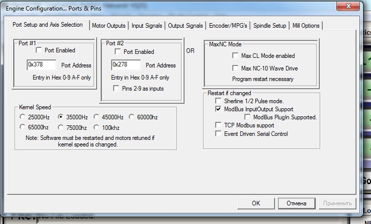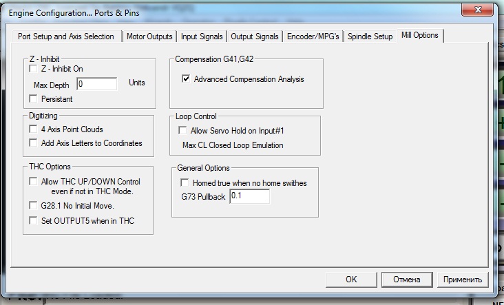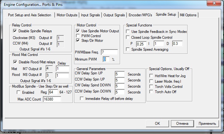 Для начала при включении шпинделя кнопкой в МАЧе происходила аварийная остановка.Поставил галочку в настройках "emulated" у "красной кнопки" и все заработало,кроме кнопки Е-стоп.Выточил деталь,выключил МАЧ и станок.Через некоторое снова включил станок,при ручном перемещении МАЧ показывает изменение координат,шпиндель либо не включается,либо работает и не выключается.Шпиндель включается через реле,при изменении настроек оно щелкает.МАЧ англицкий,лицензия.