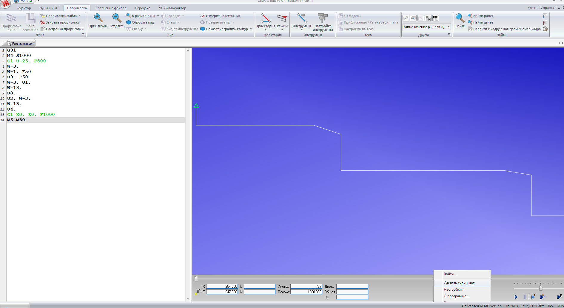 здесь вроде всё ном,а в симуляторе какие то не те движения получаются.размеры заготовки и ноль станка верны(вроде)на занятии всё получалось