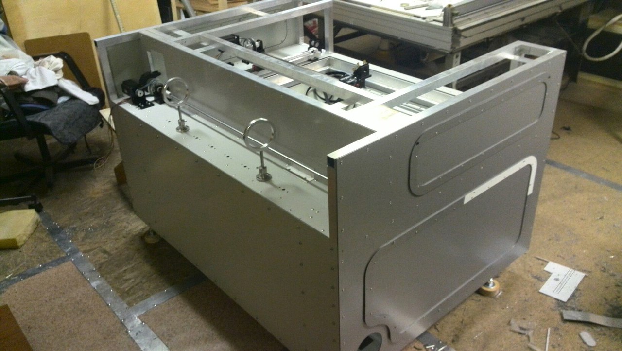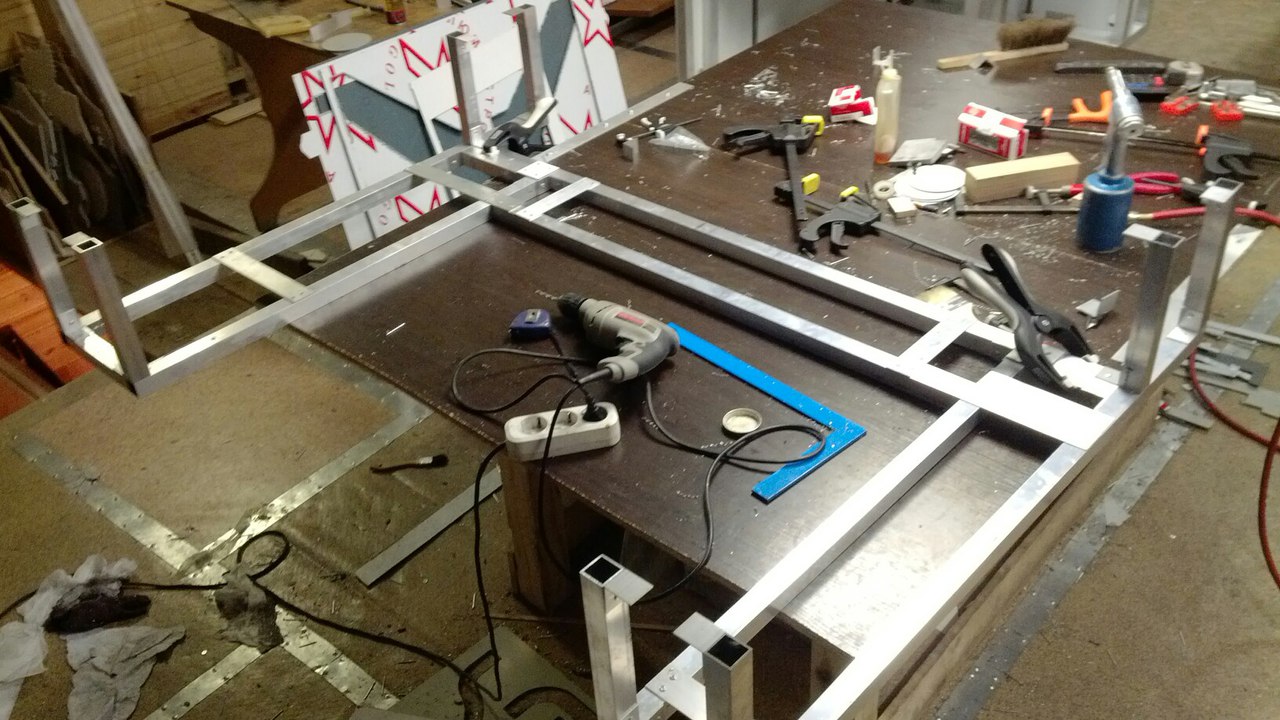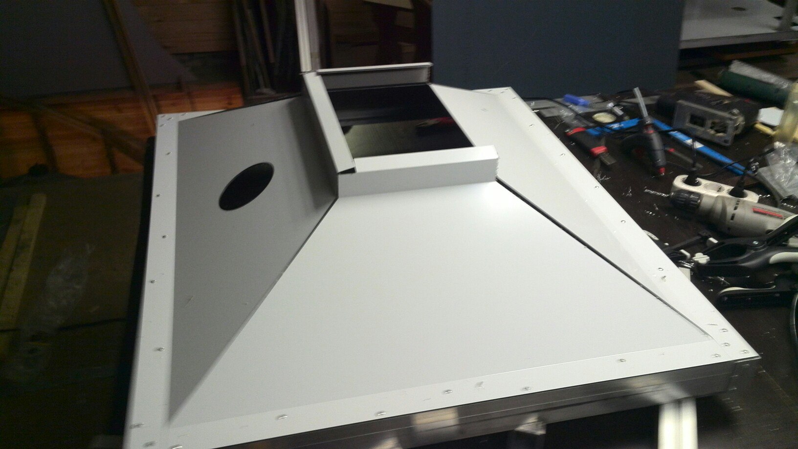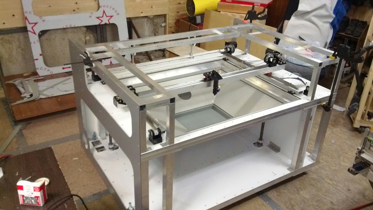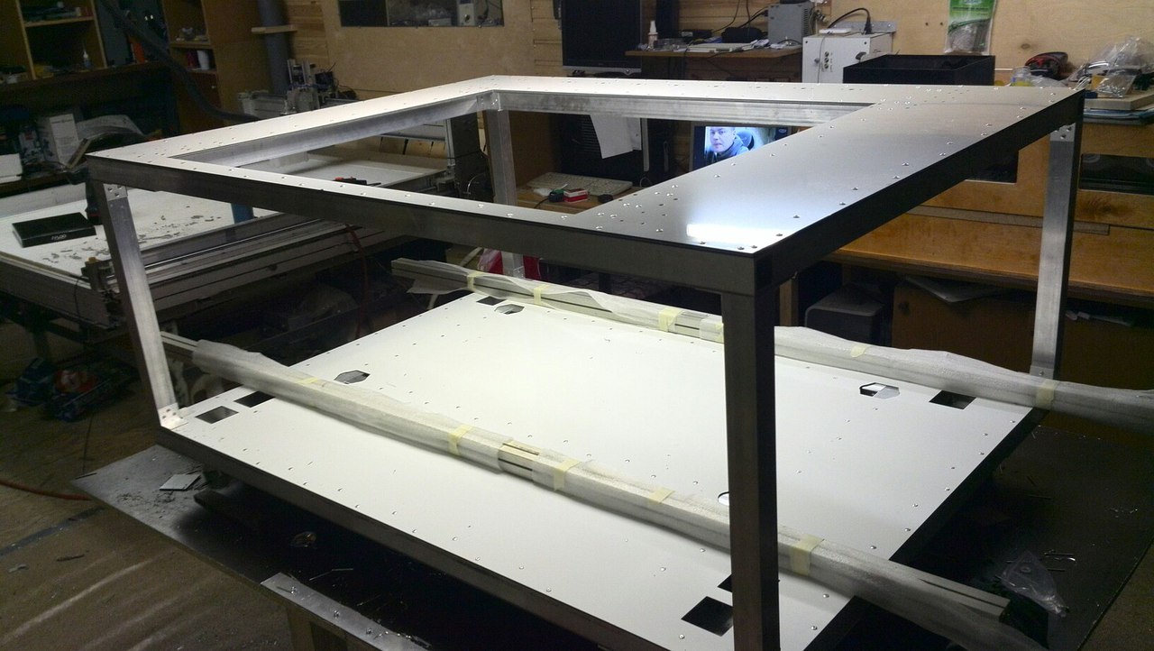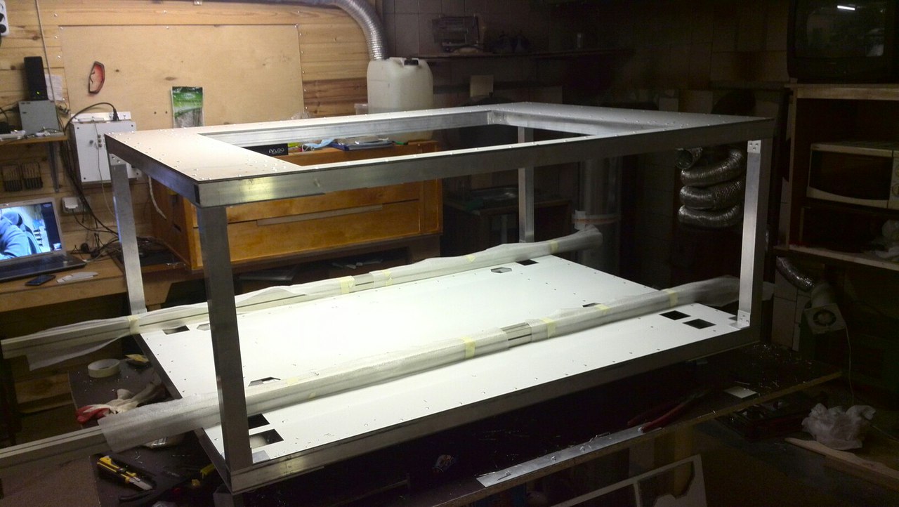 Раму делаю сборную из алюминия, (вот сейчас и делаю =)) Электроника будет в столе, вытяжка уже стоит на своем месте.
