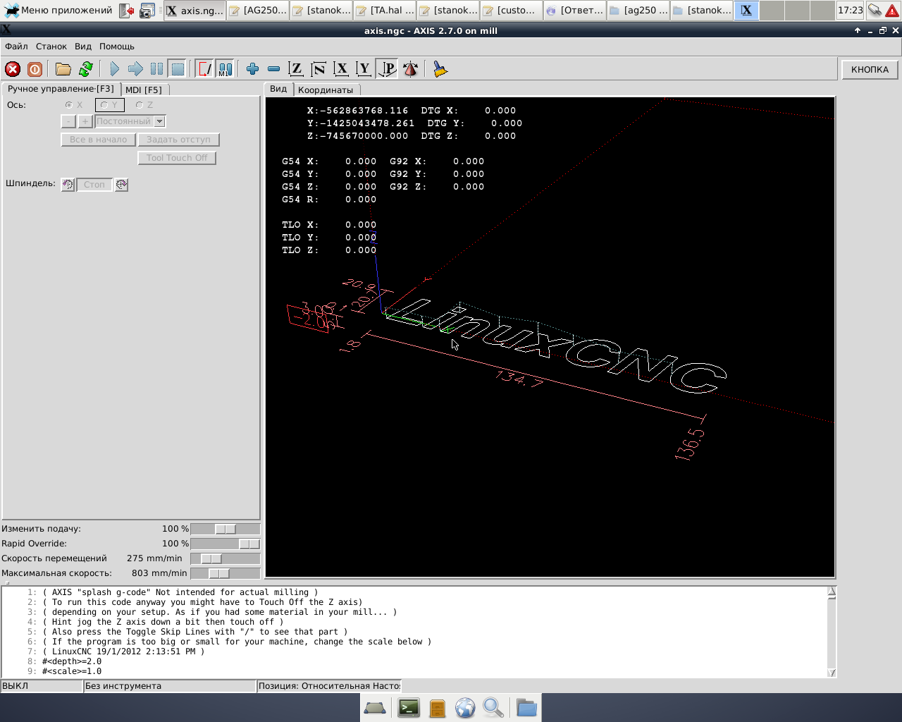 Еще вопрос- как подвигать осями отдельно? Дело в том, что при включении силы- сервоусилителей и частотника шпинделя, окна управления осей не активны. При выключении силы они становятся активными, но двигать ими нельзя- сила выключена.