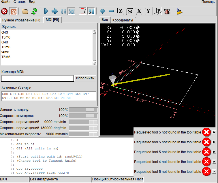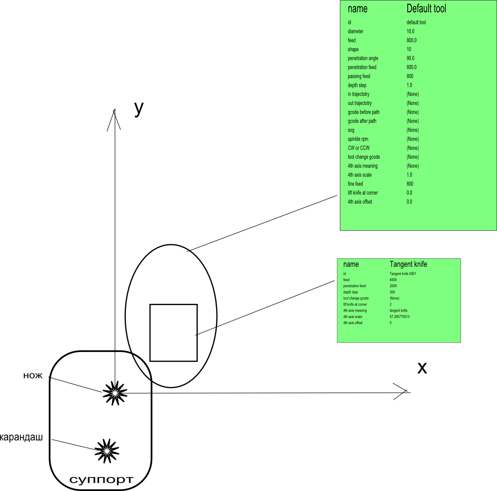 Подвел суппорт в нужную точку на столе. И мне нужно обнулить х у, а как вызвать заданный инструмент? Под номерами 4 и 5 - карандаш и нож.