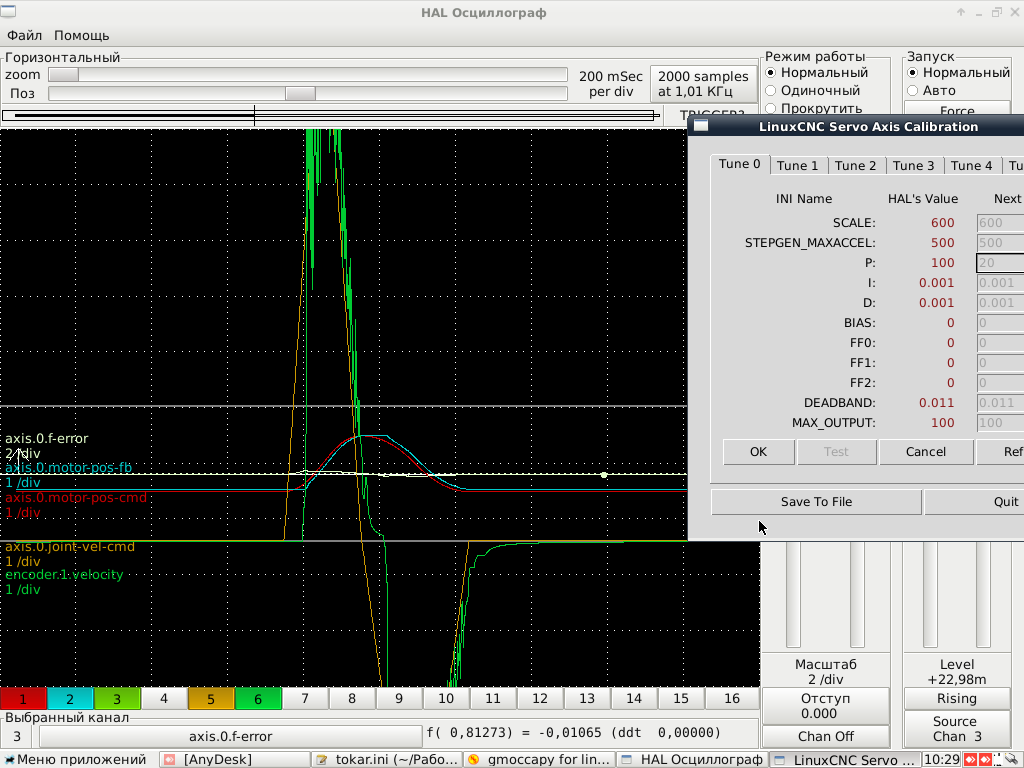 Вывел график. забил простенькую g-cod в цикле кататься туда-сюда и наблюдал меняя коэффициенты.