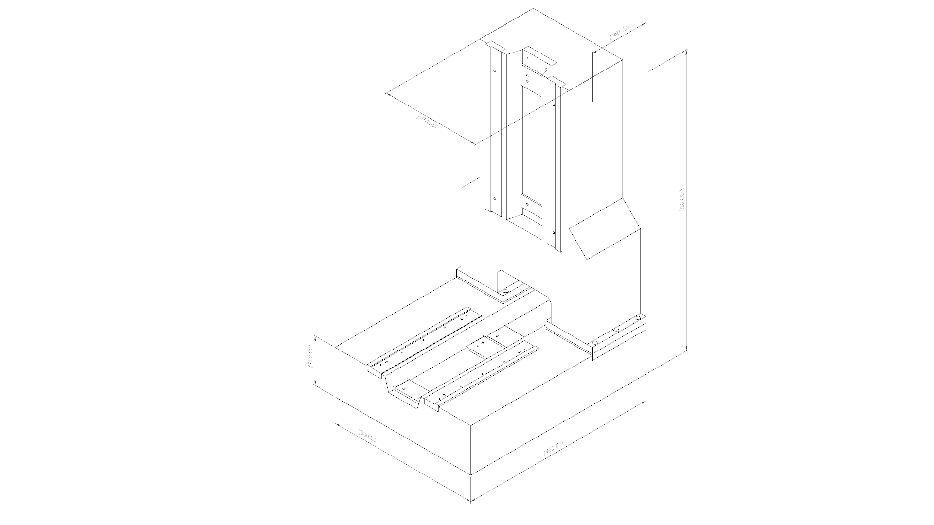 В наборе две детали: основание и колонна. Обе детали выполнены из искусственного гранита со стальными закладными. Закладные обработаны на координатно-расточном Mitsui Seiki J6B: крепежные отверстия с резьбой под направляющие (стандартный шаг отверстий 60 мм под М4 = 15 типоразмер рельс), крепежные отверстия с резьбой под опоры (стандартные под BK12 и BF12 под ШВП 20 мм), крепежные отверстия с резьбой под кронштейн двигателя М5, крепежные отверстия под установку индуктивных концевых датчиков баз станка.