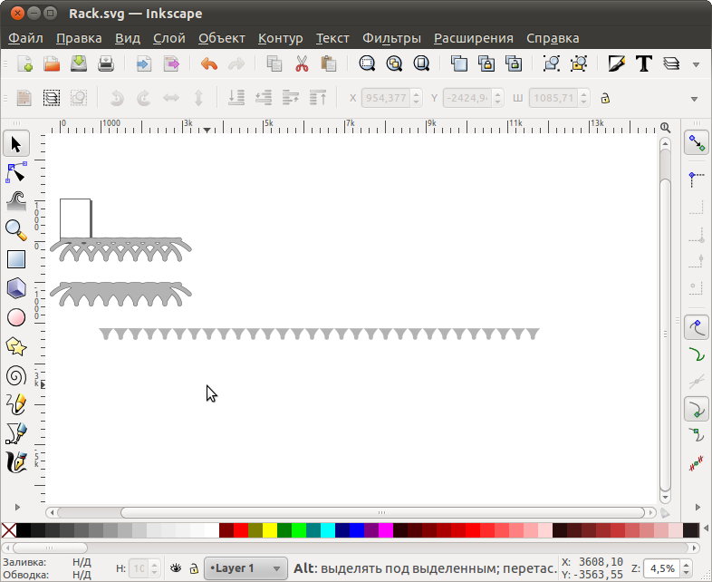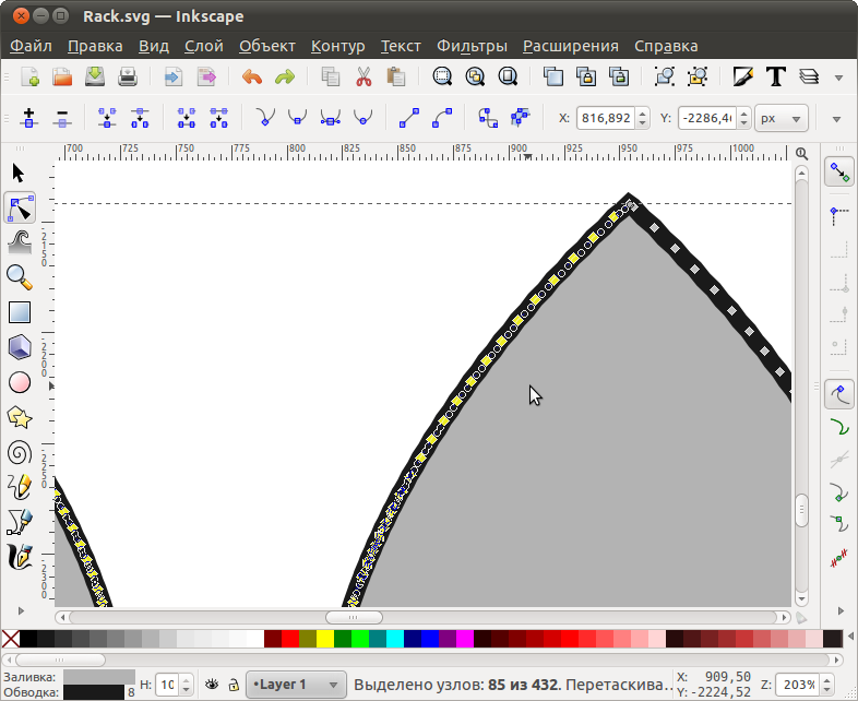 в. И объединяем концы копий (кнопа под указателем мышки): 14. В итоге получаем, этот контру можно экспортировать в Gcode при помощи gcodetools: ЗЫ этот контур лучше не преобразовывать в ломанную, т.к. снизу достаточно большие промежутки. Если будет плохо экспортиться, можно использовать Расширения - Изменить контур - Добавить узлы, выставить там По максимальной длине сегмента (размер подбирать по месту). И потом преобразовывать в ломанную.