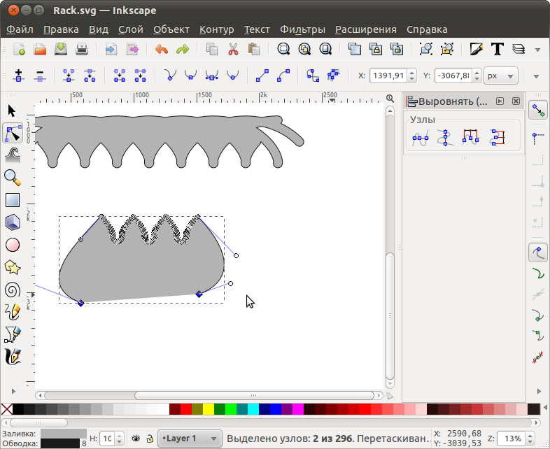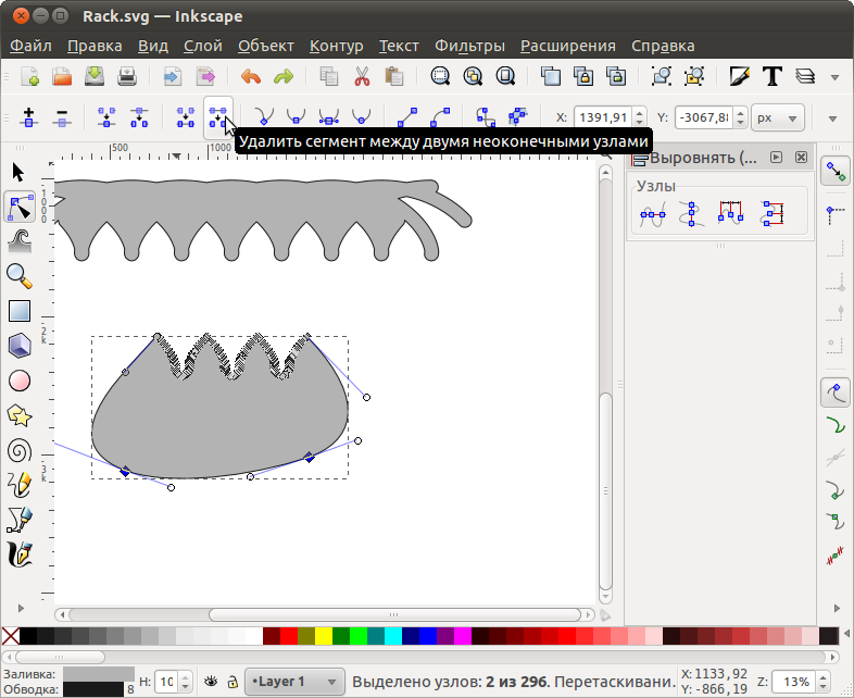 1. Сначала разбиваем контур на составляющие Ctrl+Shift+K: 2. Shift-click на большой контур, чтобы снять с него выделение и Del, чтобы удалить лишнее: 3. Включаем редактирование узлов F2: 4. Приблизительно выделяем все хорошие зубцы (крайние зубцы имеют не законченный профиль): 5. Нажимаем, Shift+1, чтобы инвертировать выделение, и Del, чтобы удалить все лишнее: 6. Я чуть-чуть изменил контур (Перетащил верхнюю дугу вниз), но это не обязательно: 7. Теперь выделяем все точки правее кончика зубца и стираем их: 8. Тоже самое справа: 9. Получаем вот-такое чудо, выбираем нижнюю дугу и разъединяем узлы (кнопа под указателем мышки): 10. Стираем два лишних узла: 11. Создаем копии из клонов: