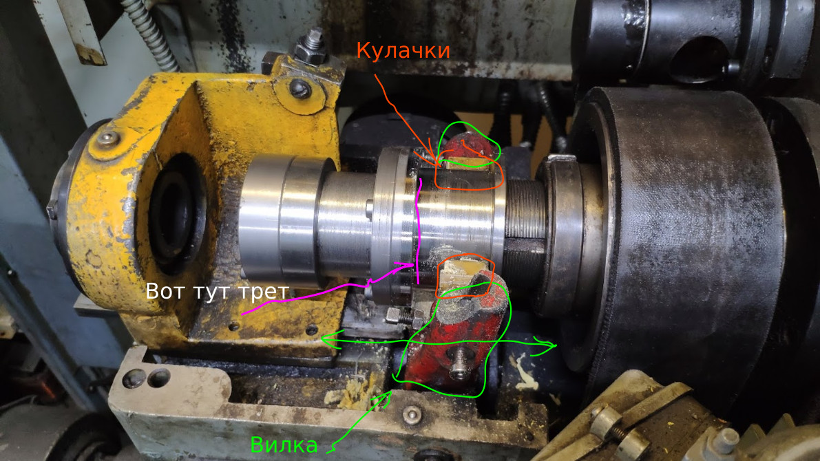 Таперичи усе ясно)). Костик все правильно расписал)) . Когда втулка 12 уходит влево - происходит разжим (шпиндель не должен вращаться). Когда вправо -зажим и вращение шпинделя включаете.Работу вилки не правильно настроили,поменялись какие то расстояния и на ходу (вращение шпинделя ) трет капитально .