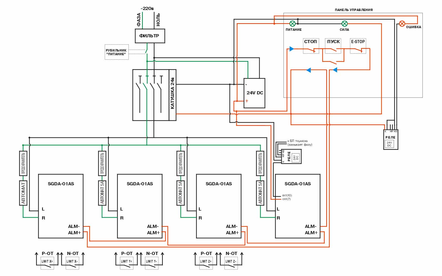 alexg-nn писал(а):Александр_, полагаю, ukr-sasha имел в виду, что на реле тормоза питание через контакты /BK нужно подавать непосредственно с источника питания 24В (как нарисовано в мануале), а у вас напряжение туда заводится через панель управления, да и при этом как-то странно шунтирует катушку пускателя.