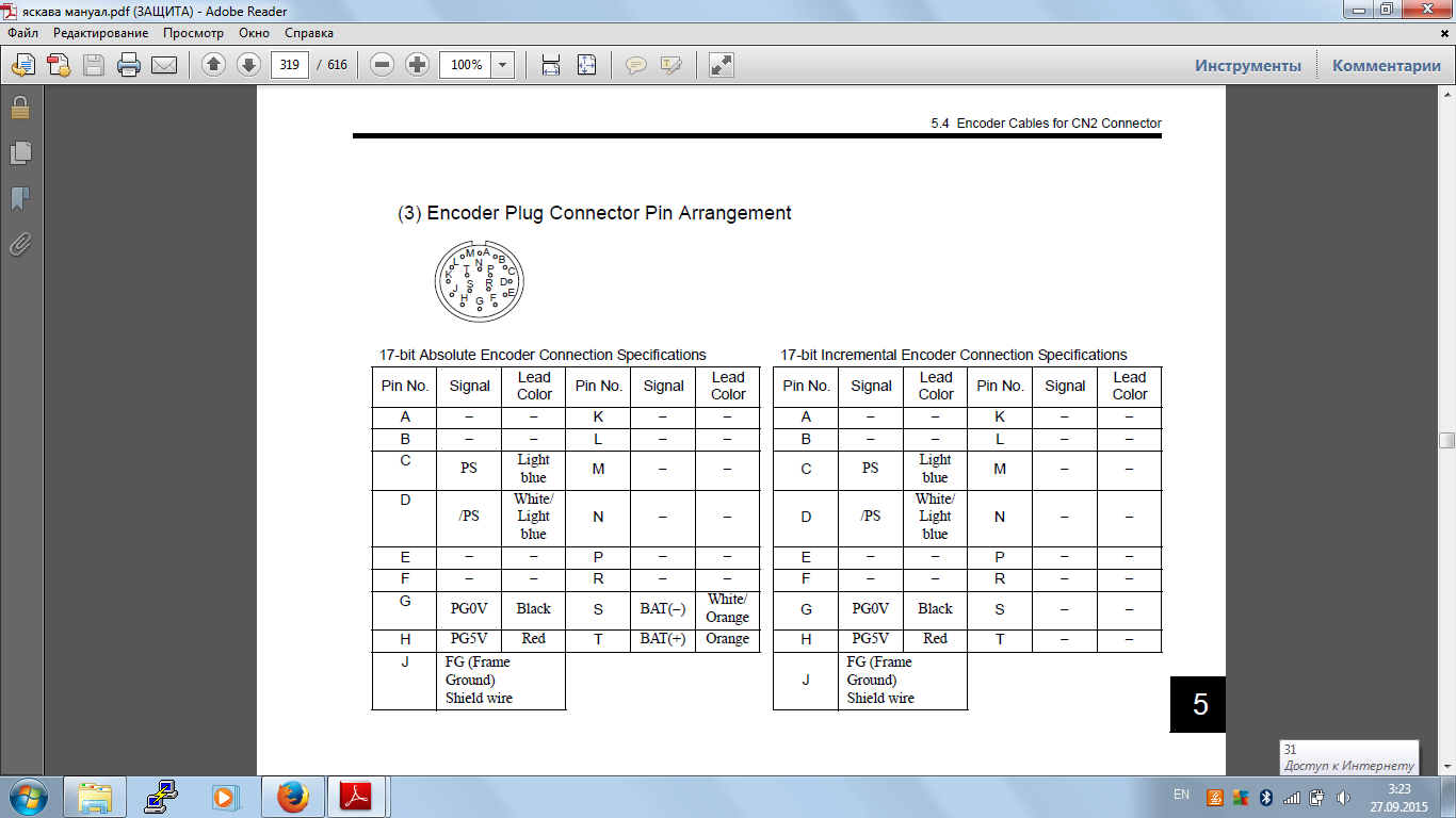 А мануал мотора говорит что из мотора в серву идет 6 проводов и экран. Это же подтверждает и разъем мотора с огрызком кабеля.