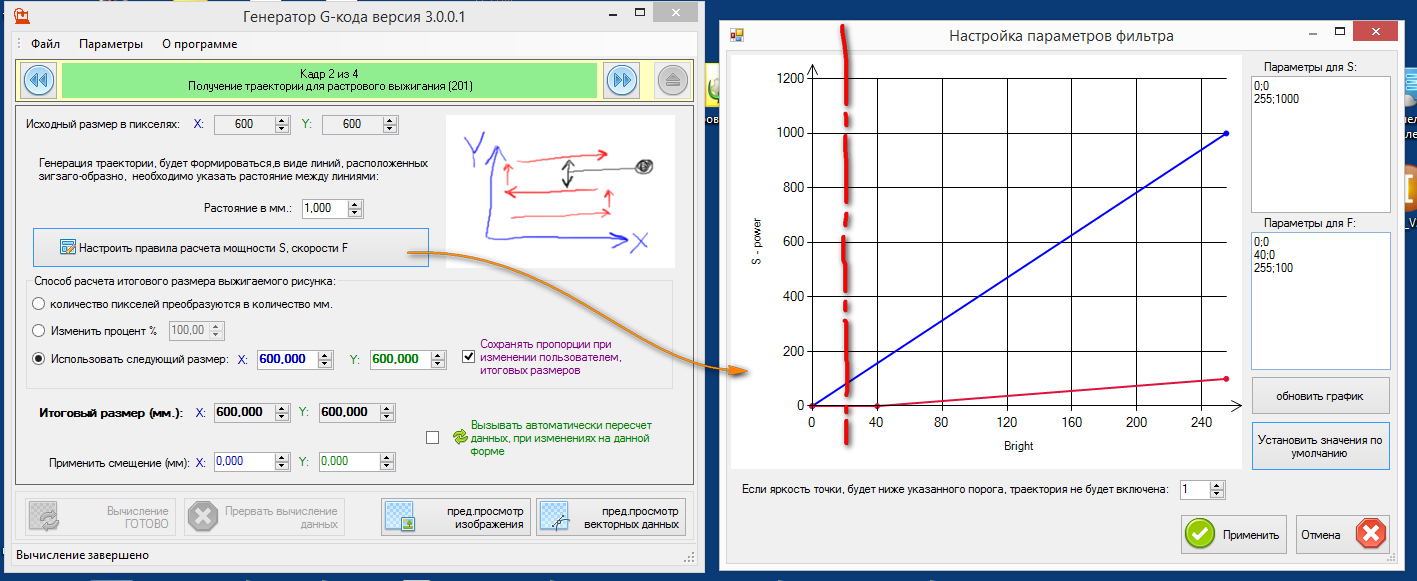 На входе например имеем размер изображения 200х100 пикселей, а мы хотим на выходе получить гравировку размером 100х50 милиметров, для этого мы указываем желаемый размер, и растояние между линиями зигзага, которое равно примерно диаметру прожигаемой точки.