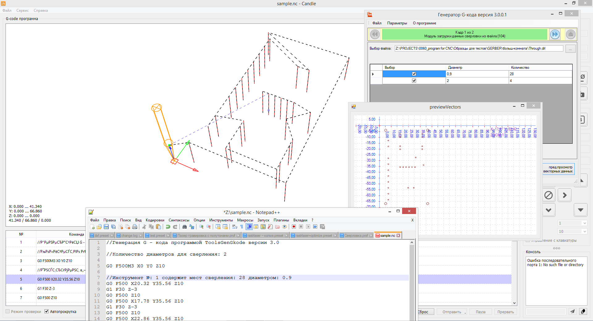 selenur писал(а):Добавил загрузку файла сверловки из DipTrace, с профилем генерации G-кода.