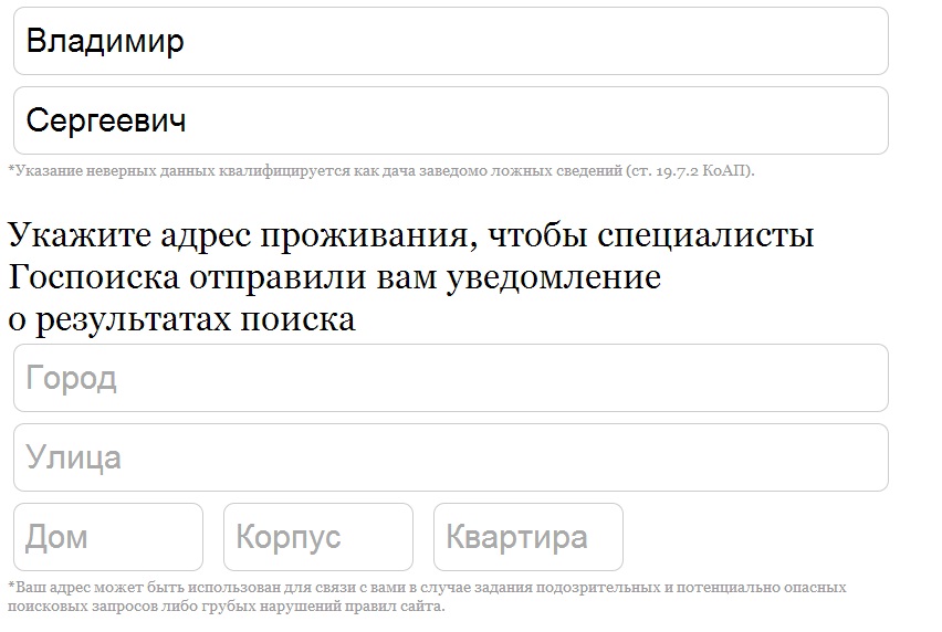 Укажите адрес проживания, чтобы специалисты Госпоиска отправили вам уведомление о результатах поиска
