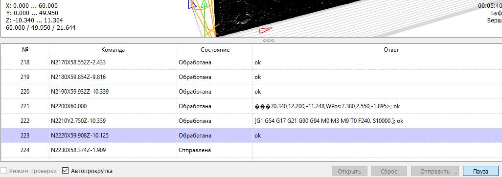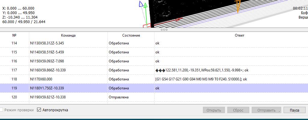 Пробовал отключить двигатели от платы - без изменений. Шпиндель изначально был отключен. Все эксперименты без подключения мотора шпинделя, т.е. в холостую. Пробовал менять БП, пробовал вовсе без него. Пробовал сменить шнур УСБ, в общей сложности попробовал 8 разных шнуров. Пробовал на 3х разных компьютерах с разными ОС ХР, 7 и 10 Пробовал в разные УСБ разъёмы. Попробовал в программе нажать галочку - Режим проверки. На визуализации всё движется веселее, светодиодик на плате мигает, но так же останавливается в визуализаторе. Пробовал другие версии программ Candle 1,1, Grblcontrol 3,6 везде через определённое время ступор. Обратил внимание, что в автопрокрутке после номера команды идёт команда, потом столбец - состояние - Обработана, Далее всегда ответ - ОК, но перед тем как зависнет в ответах иногда появляются строки [G1 G54 G17 G20 G90 G94 M0 M5 M9 T0 F300. S10000.]: ок что это?