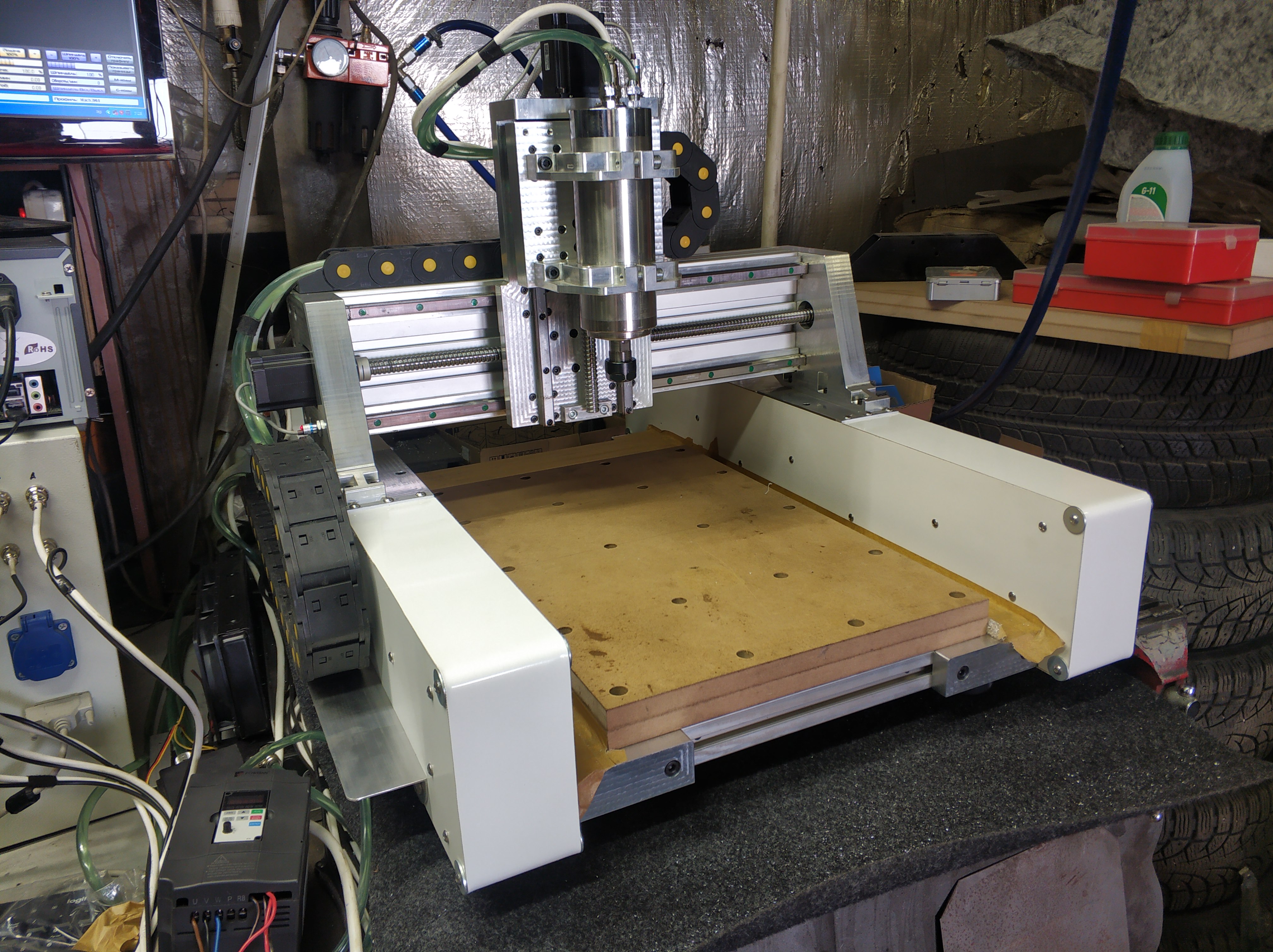Там жертвенный стол из МДФ, на т-гайки прикручен, а профиль пока скотчем заклеил))) в идеале надо какую нибудь подложку из нержи сделать, ну а так пылесос, продувка!