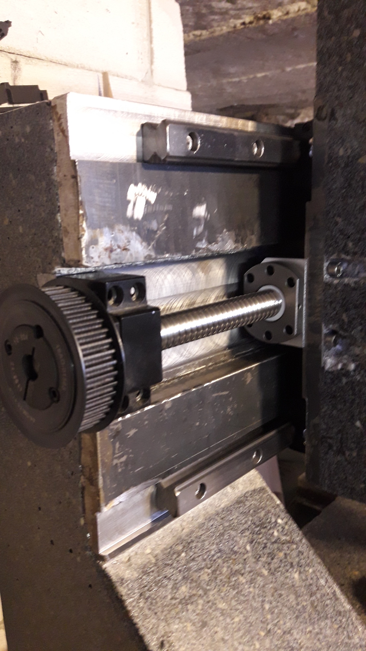 Та-да. Первая неделя работы по станку закончилась. Последнее что делал - насверливал Z с одной из сторон. Потом надо будет насквозь пройтись сверлом по бетону и опять взять по металу для обратной стороны детали (сэндвич лист 16мм, 2см полимербетона, лист 16мм) Потом придётся рассверливать все эти отверстия до 10мм для свободного прохождения болтов. Мороки короче очень много выльется, но я готов даже к арматуре в полимербетоне. Ибо теперь у меня есть свёрла по стеклу, аккуратненько можно и ими пройтись. А там останется только ШВП на Y и X присобачить, и придумать крепление крепления гайки на Y.