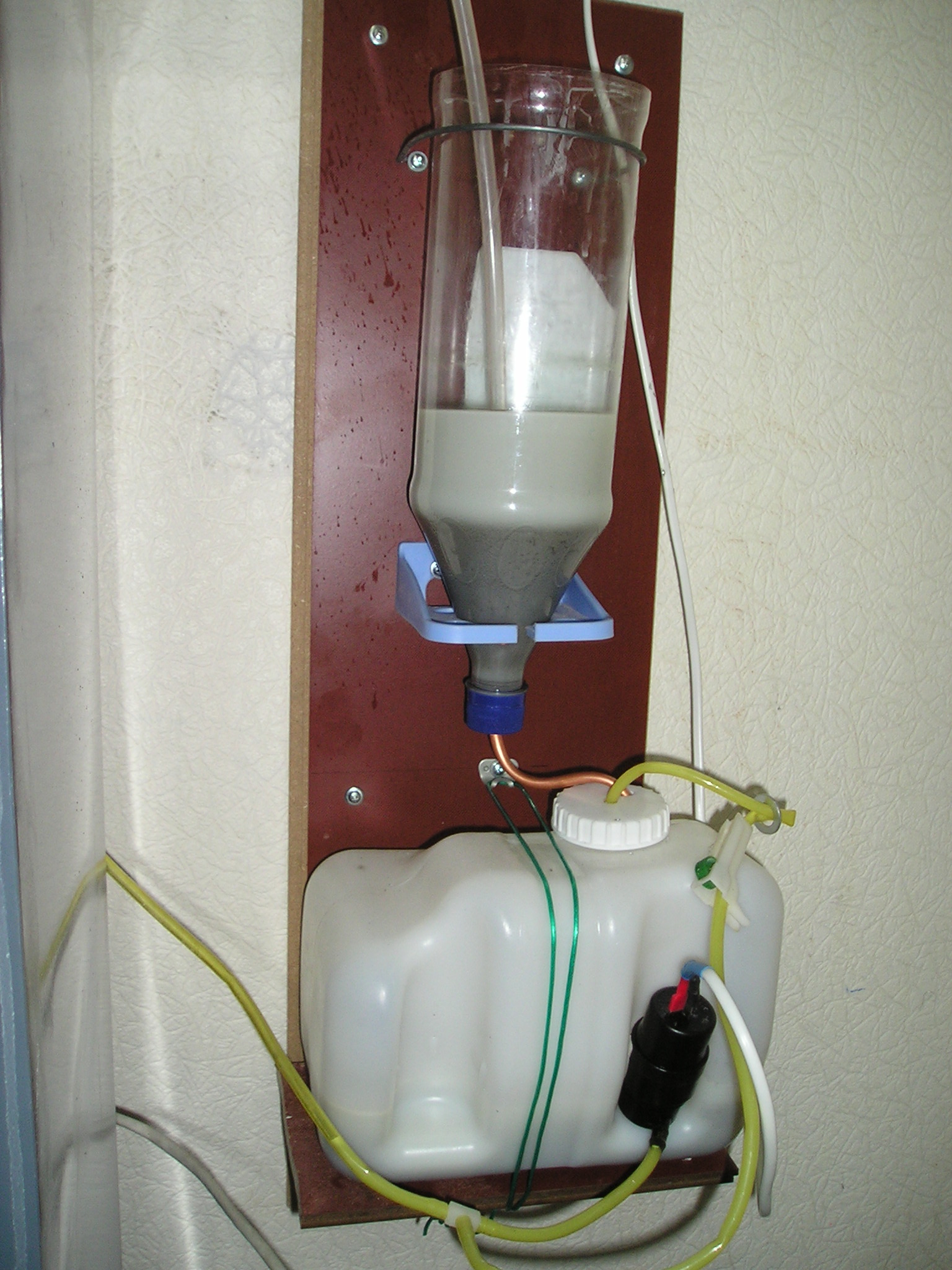 Всю конструкцию пришлось переместить ниже уровня стола. Перевернутая бутылка - теперь отстойник. Медная трубка поднимается до поверхности жидкости, откуда СОЖ стекает в бачок, а стружка скапливается в горловине бутылки.