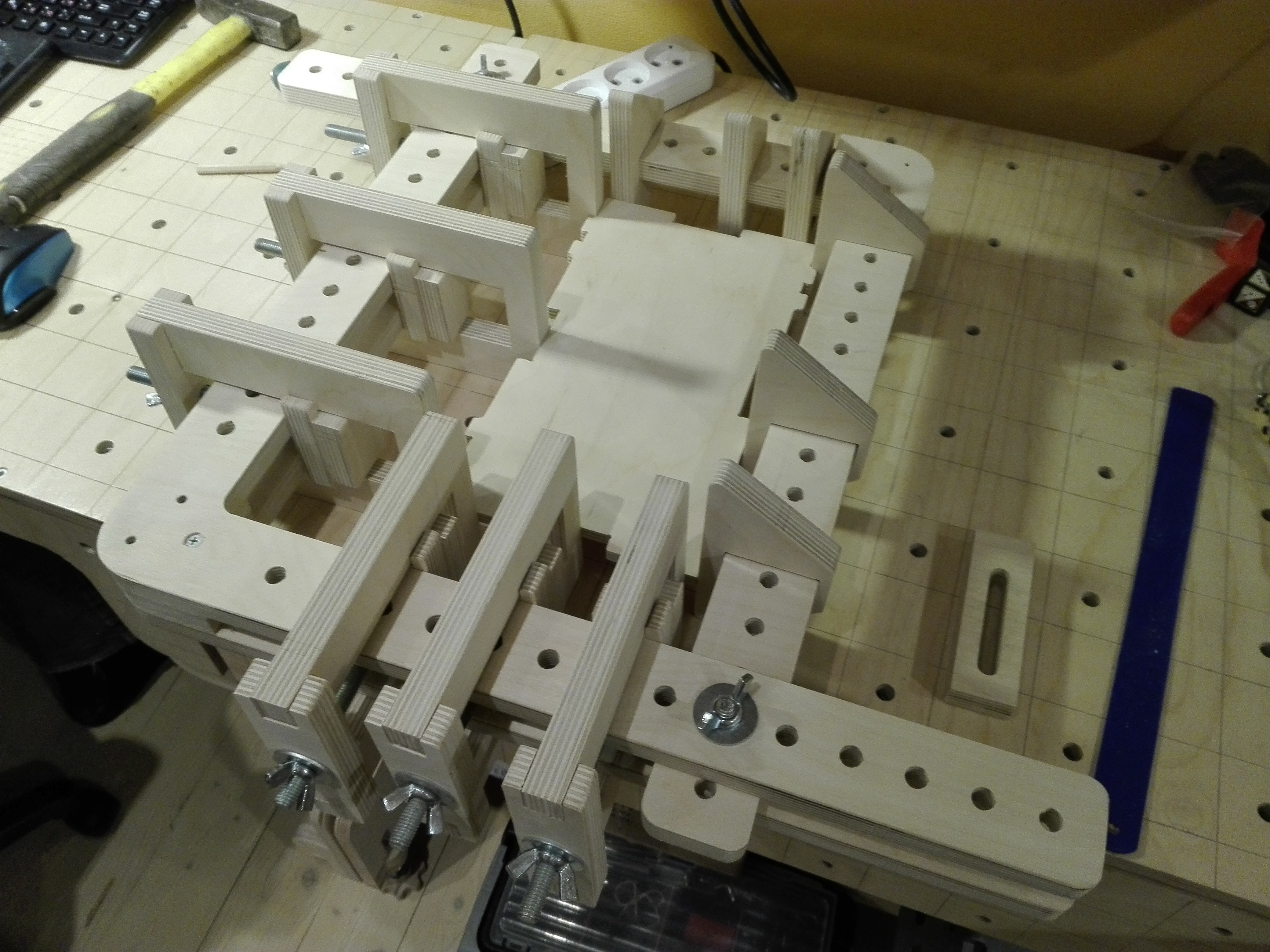 Пока клеил для стены коробочки и кассеты, устал обвязывать все струбцинками. Оказалось, что пытливые умы в Америке уже решили проблему. Подсмотрел и повторил чертежик, но уже в метрической системе. Плюс, форму и механику струбцинок модифицировал чтобы было удобнее. Американцы, конечно изобретательны, но местами ленятся додумывать до идеала.