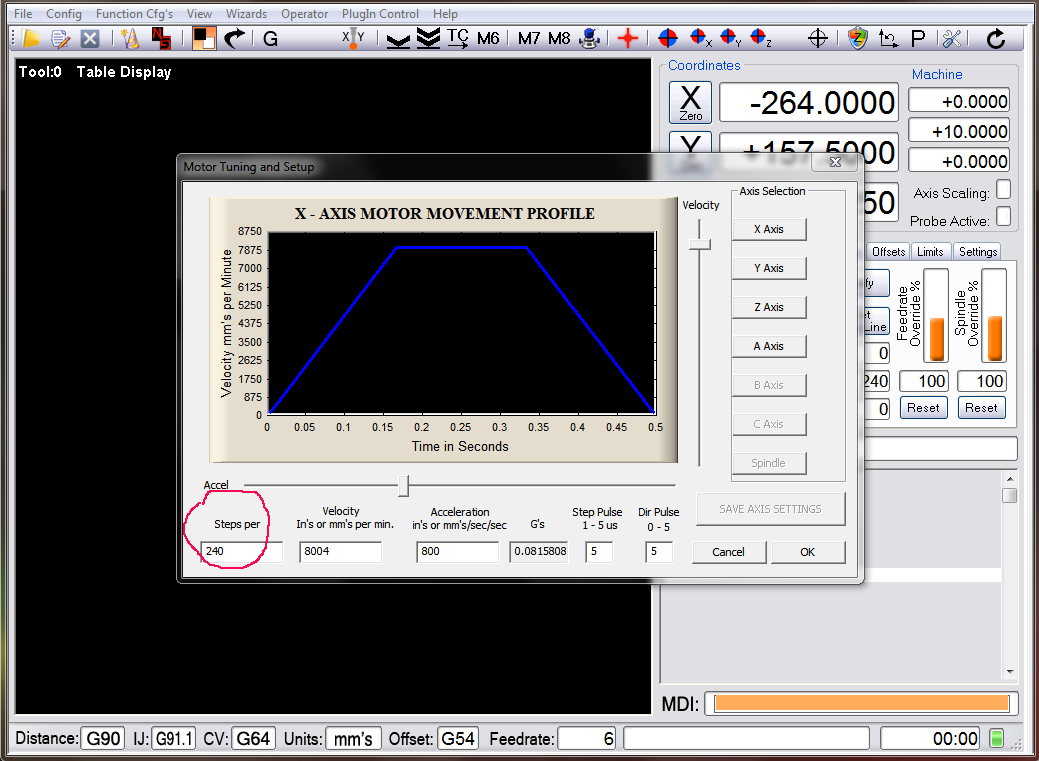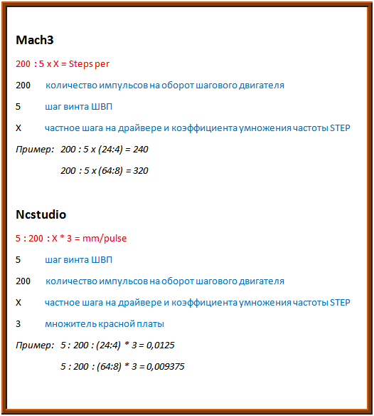 в китайских лазерных контроллерах настройка перемещения задается в количестве тысячных (микрон)долей миллиметра/импульс........т е на сколько микрон перемещается ось за один импульс контроллера...... В МАЧе наоборот- количество импульсов на один мм перемещения.......