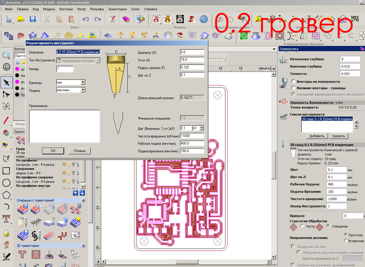 sergey27rus писал(а):Диаметр фрезы 3,17 или 3,175, можно уменьшить диаметр кончика и указать как 0,04. я так делал, только ставил для обработки 2 прохода, первый как бы надрезает/царапает медный слой, вторым чуть глубже.
