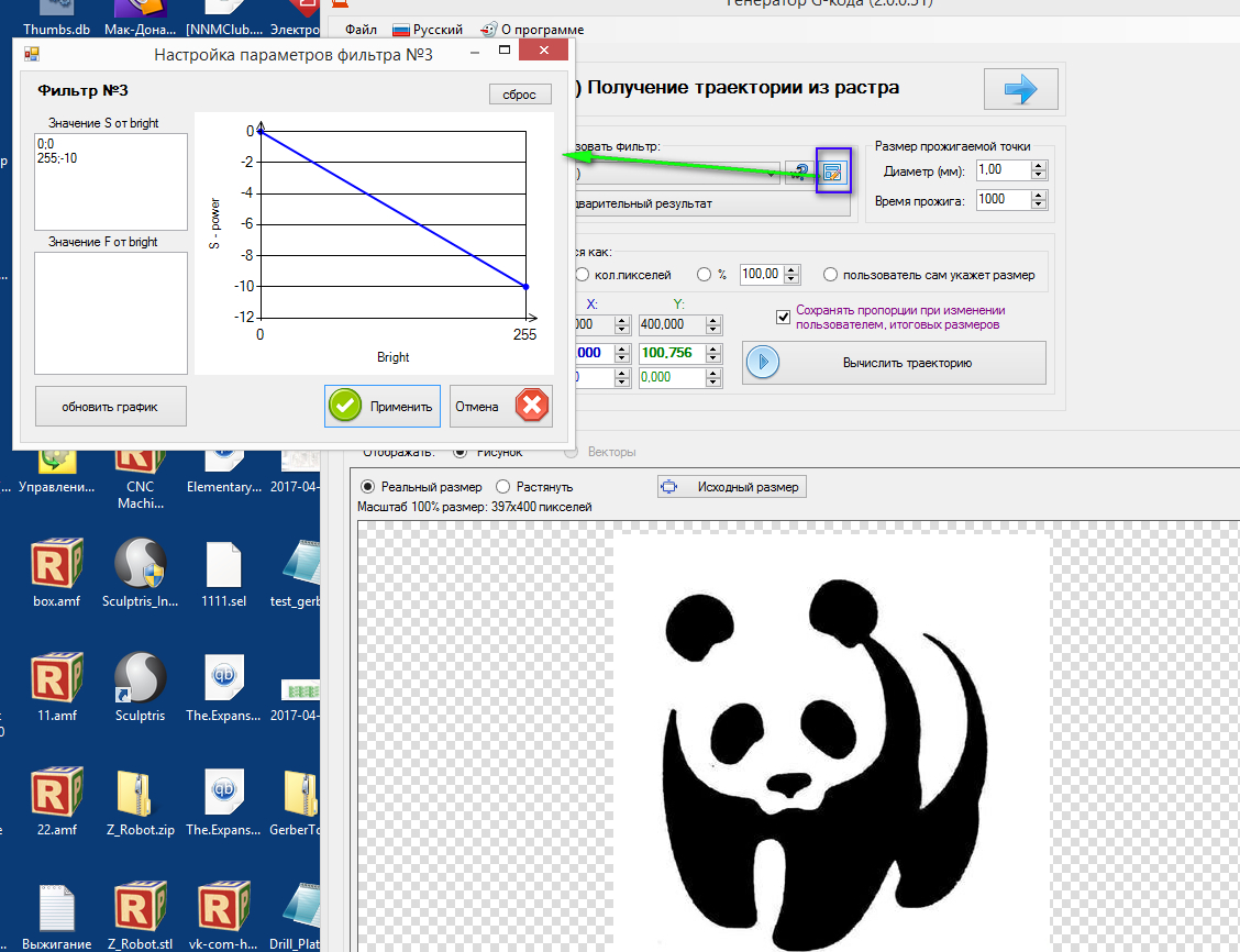 2) В модуле выбирается алгоритм преобразования рисунка в векторные данные, и выбирается пользовательский профиль. И при нажатии вычислить, происходит вычисление яркости, скорости, или значения высоты по Z, у кого управление мощностью связано с осью Z, согласно графика.
