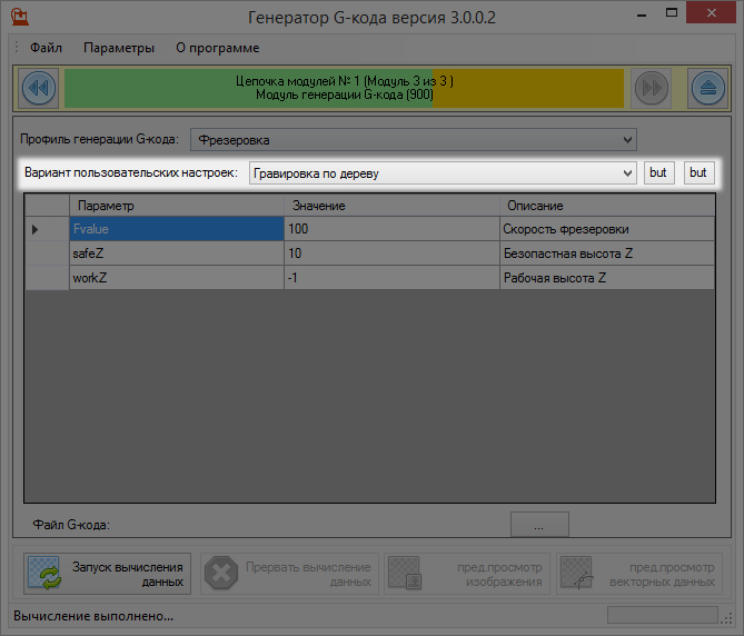 3) В модуле генерации g-кода выбирается профиль станка, где в качестве скорости/мощности используются значения из модуля №2, т.е. пользовательских параметров в данном профиле не будет.